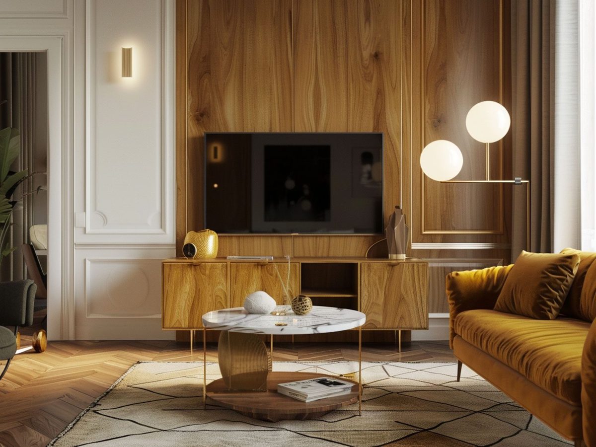 Dodatkowym atutem tej aranżacji jest bogata paleta barw – ciepłe odcienie drewna i neutralne tła współgrają z intensywnymi akcentami kolorystycznymi, co sprawia, że wnętrze zyskuje dynamiczny i wielowymiarowy charakter. Taka kompozycja idealnie sprawdzi się w salonach, gdzie każdy detal ma znaczenie, a całość opowiada historię przez zróżnicowanie form i epok.