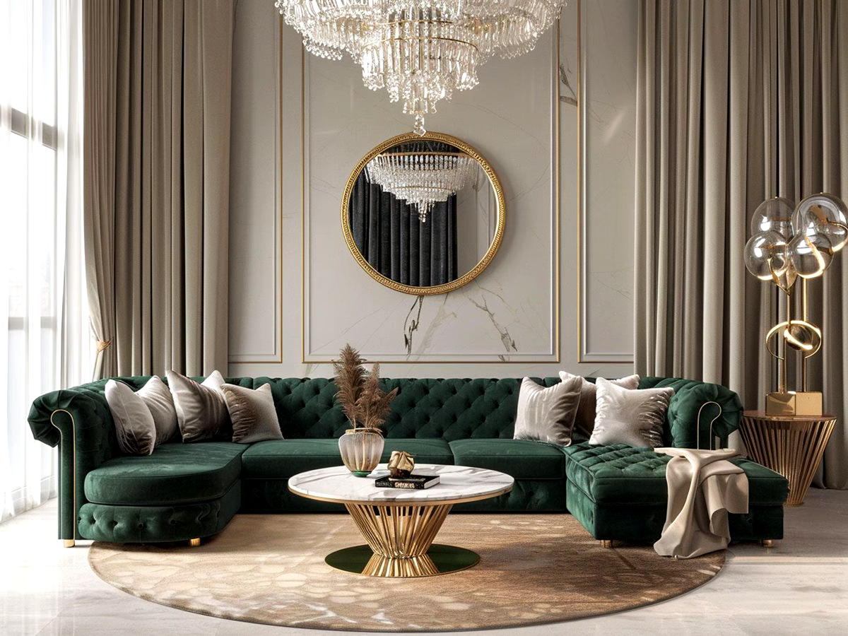 • Efektowne detale dekoracyjne – Kryształowe żyrandole, ozdobne ramki, designerskie wazony i lustra podkreślają luksusowy charakter przestrzeni.