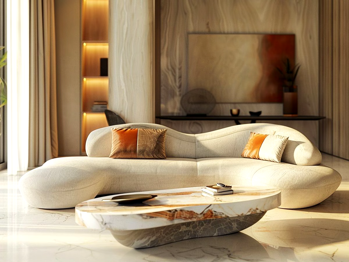 - Salon z futurystycznymi meblami: W jednym z projektów, centralnym punktem stała się sofa o organicznych, płynnych kształtach, wykonana z nowoczesnych, formowanych materiałów. Stolik kawowy, zaprojektowany w niestandardowej formie, w połączeniu z delikatnym oświetleniem, tworzy atmosferę przyszłości, gdzie funkcjonalność spotyka się z artystycznym wyrazem.