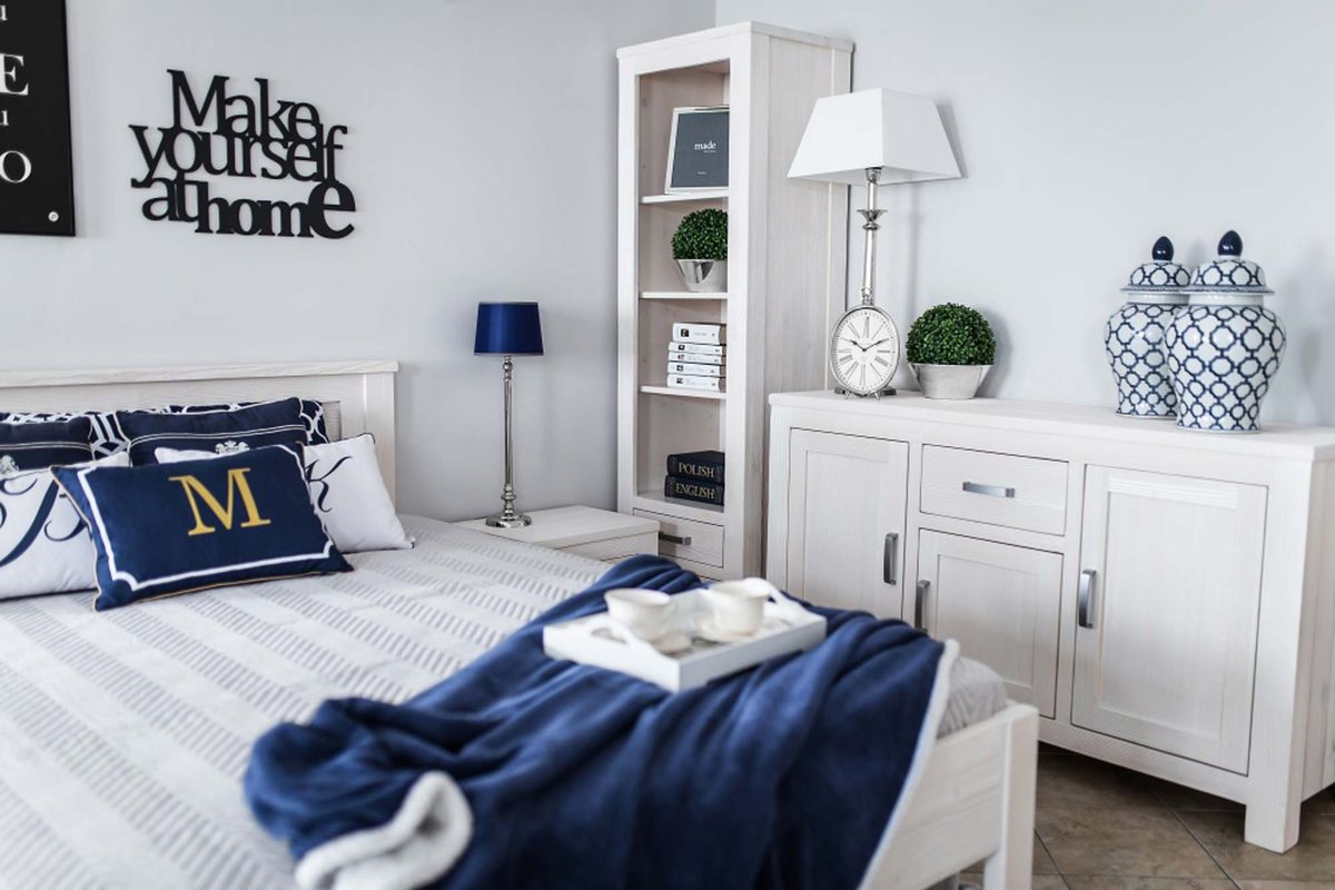 Komplet białych drewnianych mebli do sypialni aranżacja