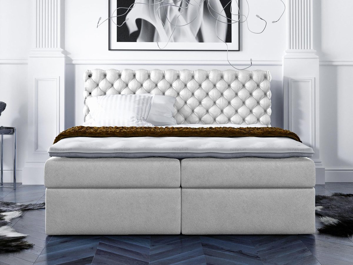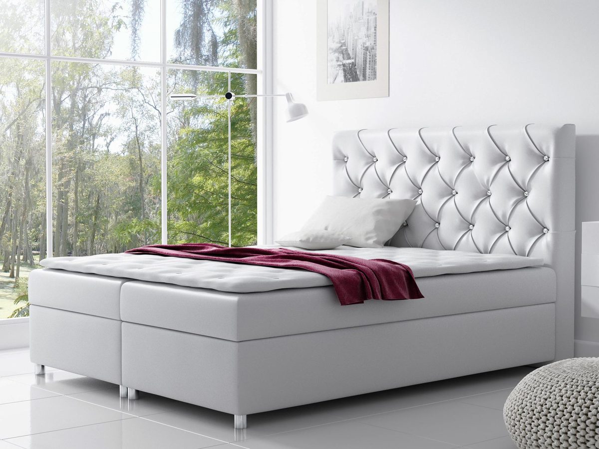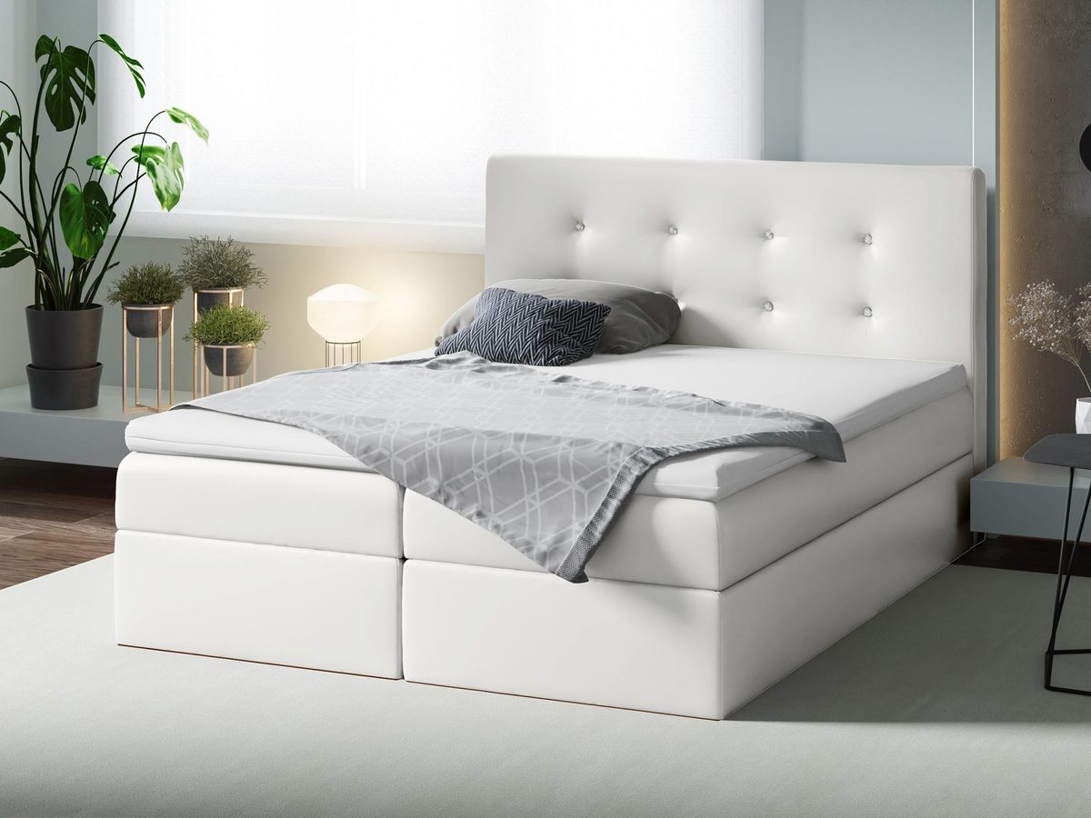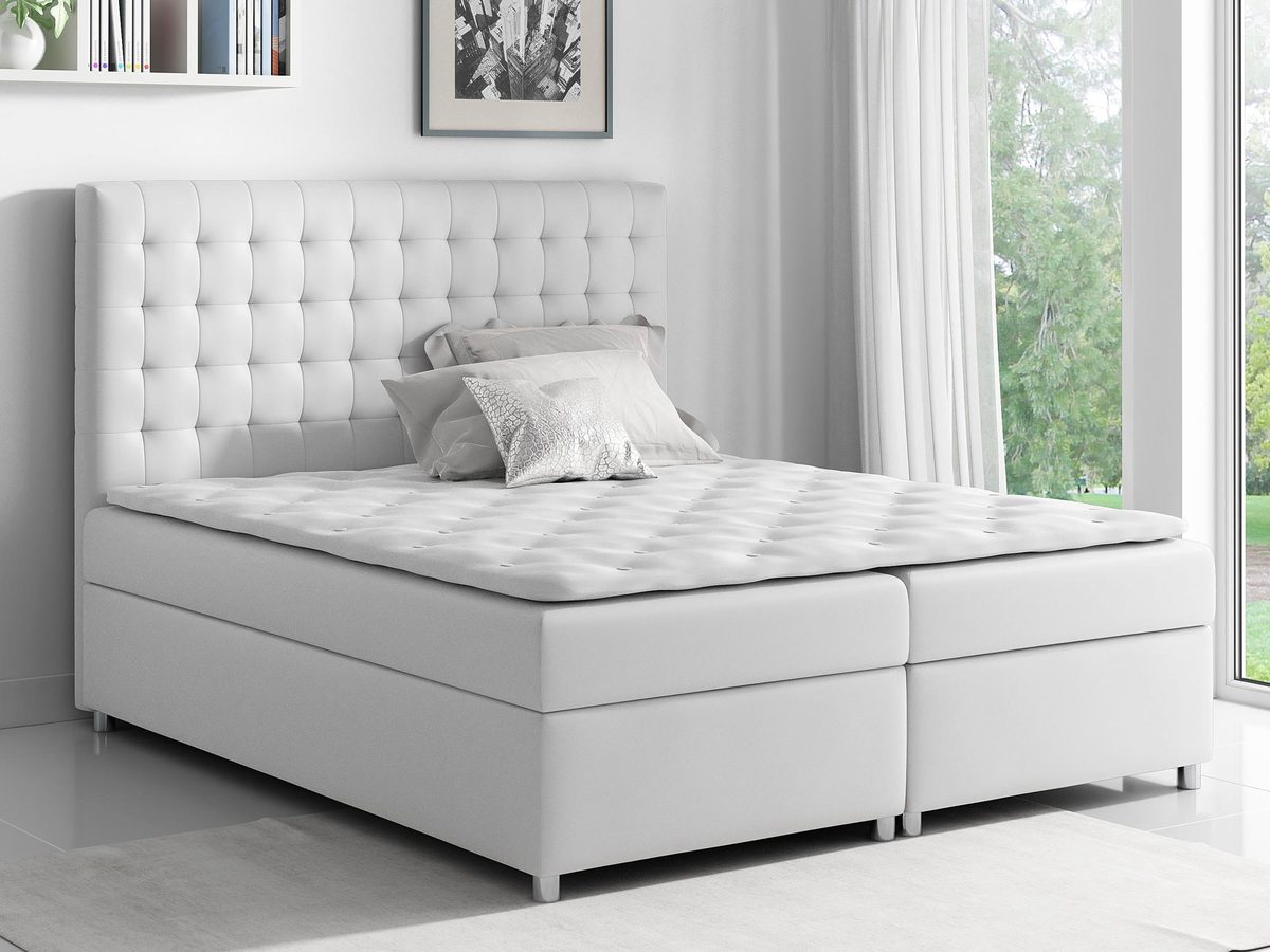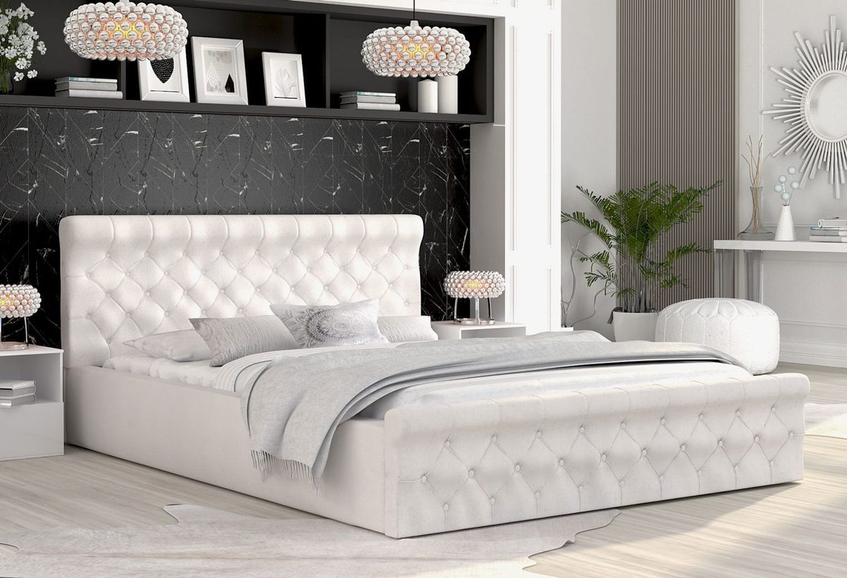 Łóżko pikowane z wysokim oparciem GEORGE doskonale sprawdzi się zarówno w nowoczesnym, jak i bardziej klasycznym wnętrzu sypialni, dodając mu niezwykle eleganckiego charakteru. Ponadto mebel wyposażony został w dwa pojemniki do przechowywania. Co więcej ten model umieszczony na chromowanych nóżkach wbudowany ma sprężynowy materac oraz topper piankowy – połączenie tych dwóch warstw materacy sprawia, że łóżko jest niezwykle wygodne.