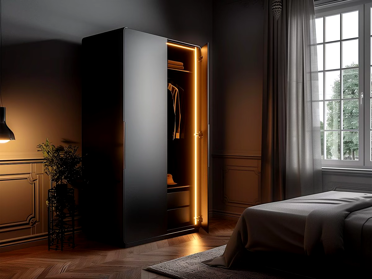 Dobrze dobrane oświetlenie wnętrza czarnej szafy ułatwi codzienne korzystanie i sprawi, że przestrzeń będzie bardziej funkcjonalna.