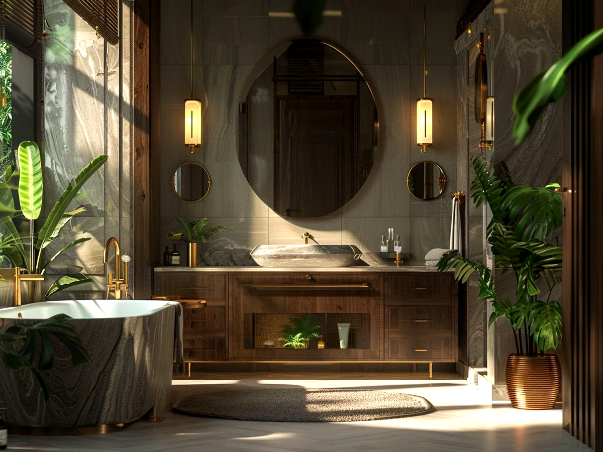 • Rustykalny klimat: Drewniane szafki, lustra w naturalnych ramach oraz dodatki wykonane z kamienia czy metalu tworzą przytulną, ciepłą przestrzeń, idealną do relaksu.