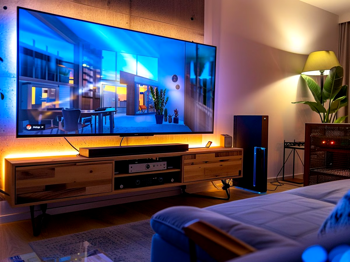 Nowoczesny salon gamingowy z podświetleniem LED i dużym ekranem