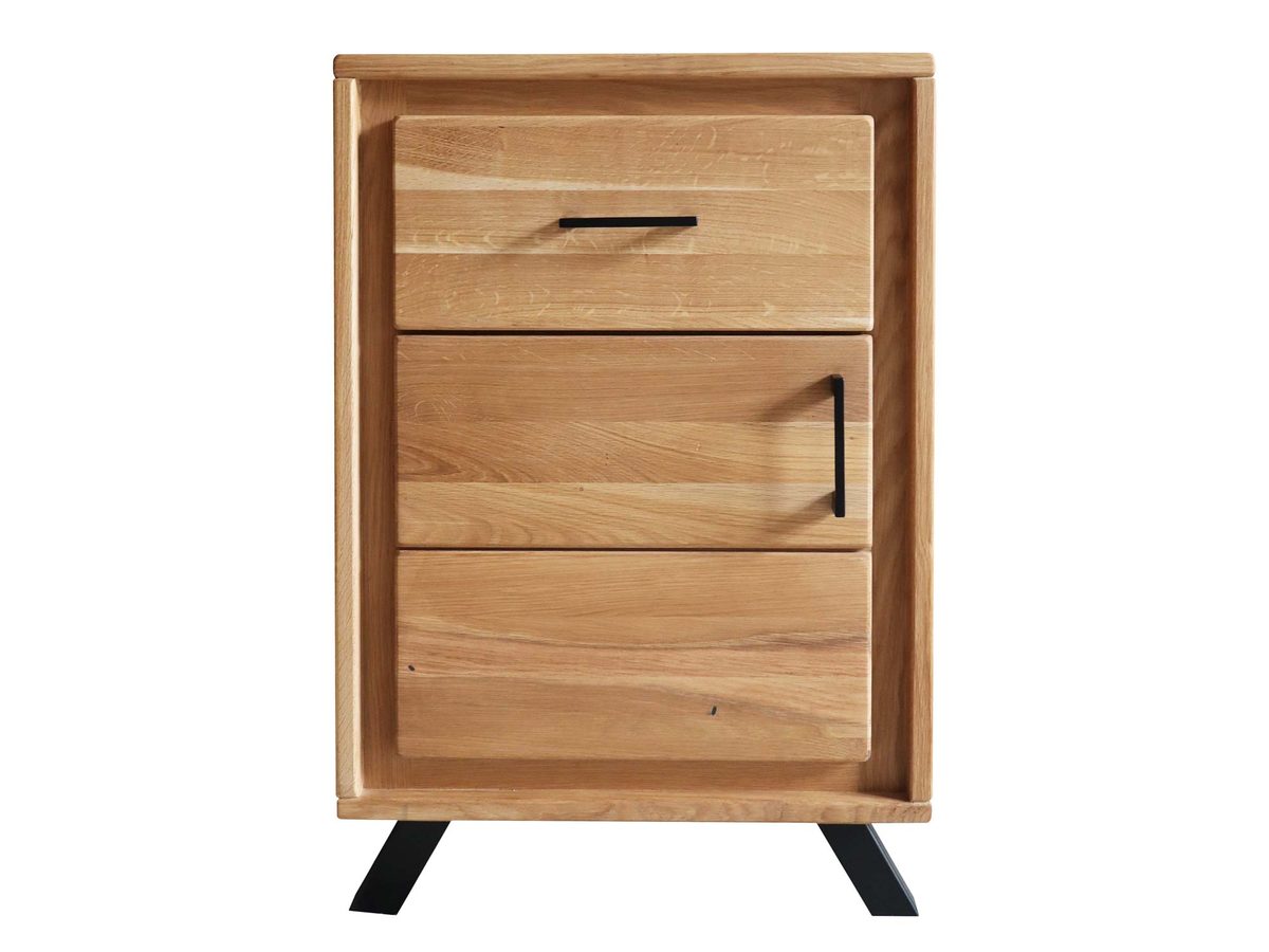 Jeśli posiadasz sypialnie zaaranżowaną w stylu skandynawskim warto wtedy wybrać nieskomplikowaną szafeczkę, najlepiej drewnianą lub też pokrytą naturalną okleiną w jasnym odcieniu drewna. To świetny wybór także do dodatków o asymetrycznych formach, futurystycznych łóżek i innych mebli stylizowanych na loftowe czy industrialne. W tym wypadku proponujemy szafkę nocną na czarnych nóżkach wraz z czarnymi uchwytami. Szafka posiada praktyczną szufladę.