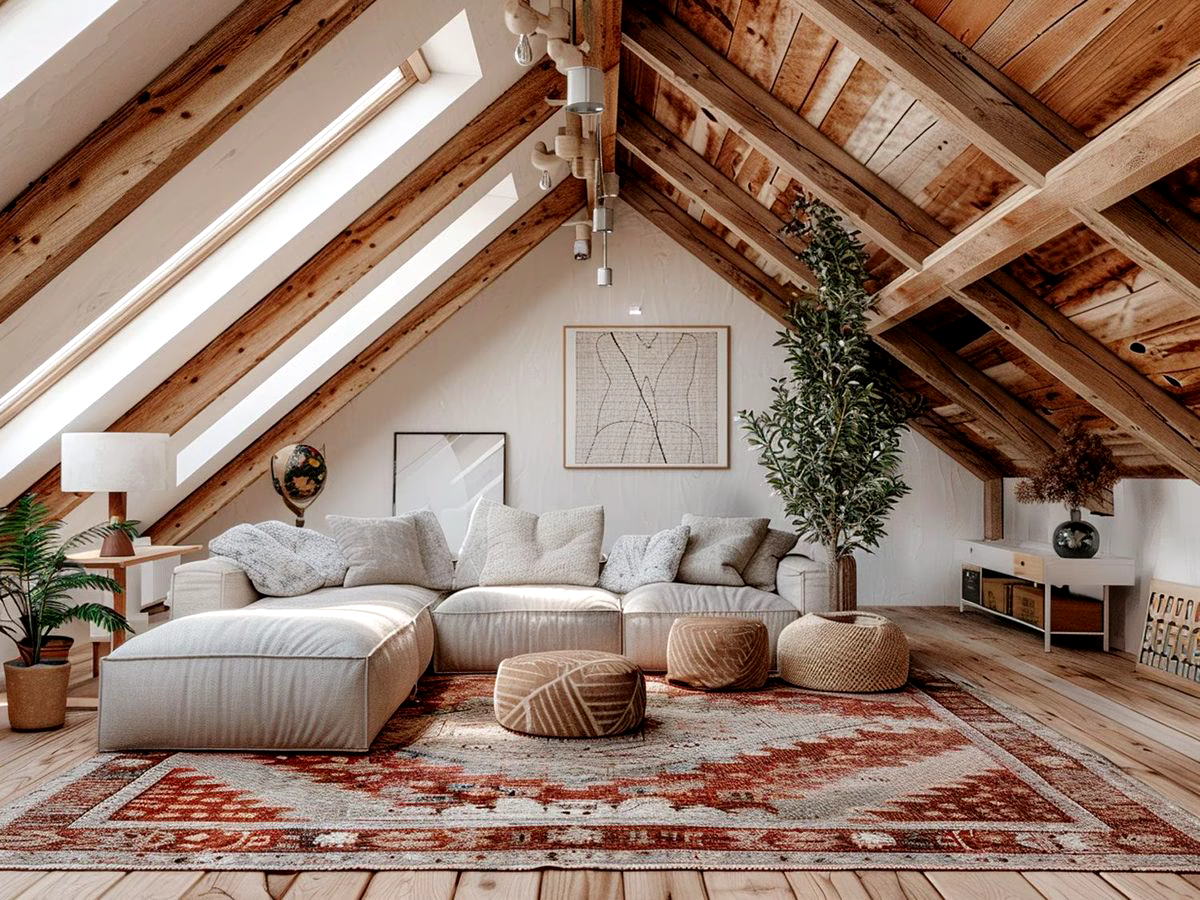 Eklektyczne zestawienie kolorów, różnorodność tekstur i ręcznie robione dodatki sprawiają, że wnętrze nabiera artystycznego i niepowtarzalnego charakteru. Meble tapicerowane w ciepłych barwach, zestawione z unikatowymi dywanami i kolorowymi poduszkami, tworzą przestrzeń idealną do relaksu i swobodnej ekspresji.