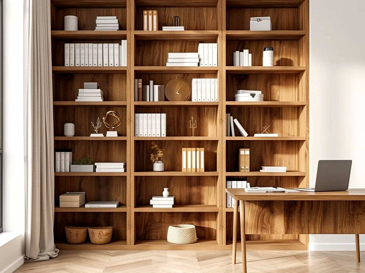 - Ciepło naturalnych materiałów: Drewniane regały wprowadzają do biura przytulność i ponadczasowy styl, doskonale komponując się z nowoczesnymi, minimalistycznymi meblami.