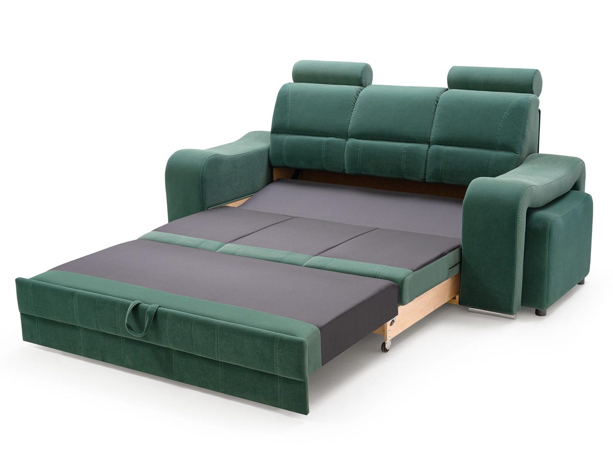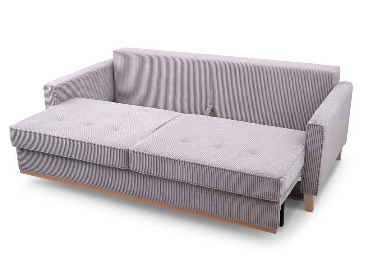 Zaczynamy od wyciągnięcia wózka (wyposażonego w kółka), który kryje się pod siedziskiem. Następnie należy odwrócić miękką część siedziska i rozłożyć ją na wysuniętą konstrukcję. Ten rodzaj rozkładania zapewnia stosunkowo dużą przestrzeń spania i nie wymaga odsuwania od ściany.
