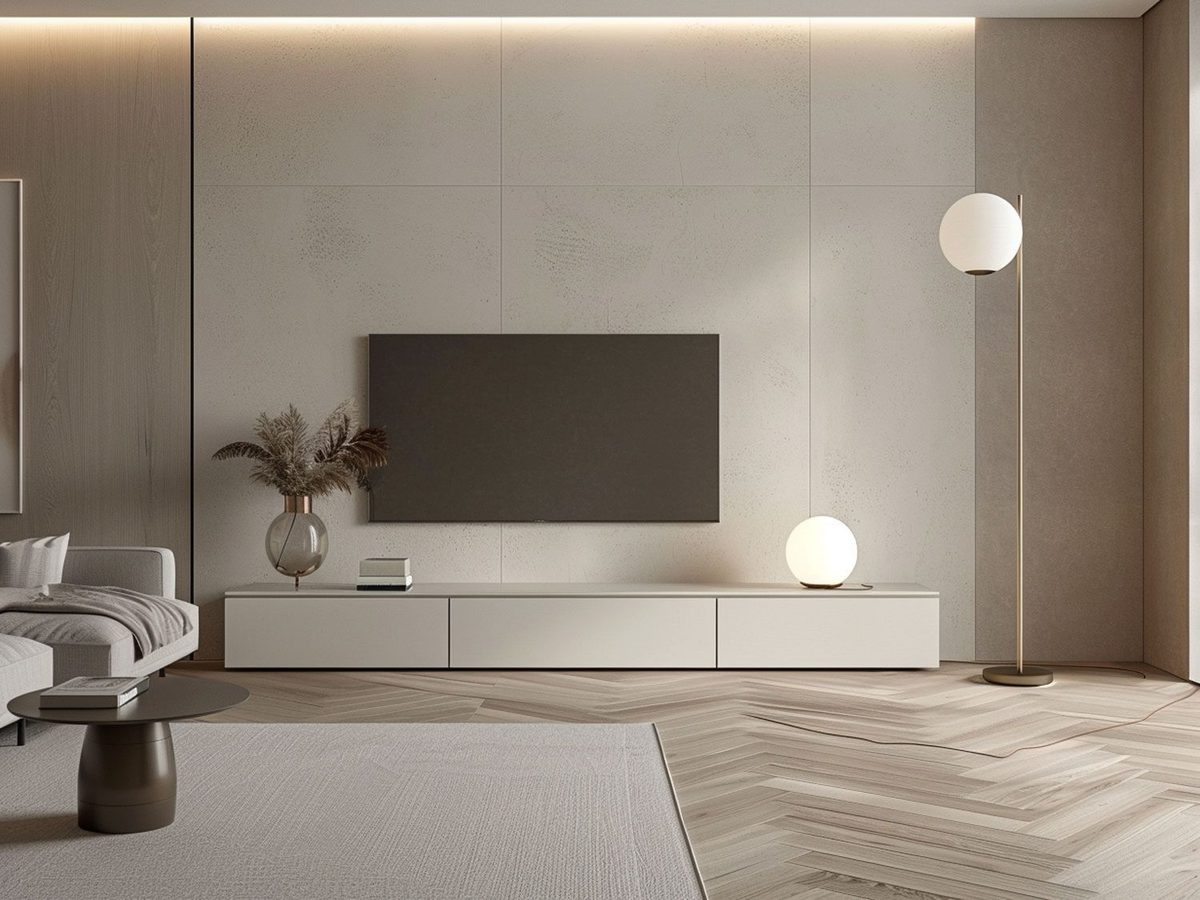W salonie utrzymanym w jasnych, neutralnych barwach dominuje spokój i harmonia. Idealnie sprawdza się tu szafka RTV o prostych, geometrycznych kształtach. Wykonana z lakierowanego MDF i uzupełniona metalicznymi akcentami, przyciąga wzrok subtelnym połyskiem. Zintegrowany system zarządzania kablami pozwala zachować porządek i estetykę. Minimalistyczne dodatki, takie jak stylowe lampy czy delikatne obrazy, podkreślają nowoczesny charakter wnętrza. Przestrzeń zachwyca lekkością, elegancją i doskonałą organizacją codziennej funkcjonalności. Taki salon sprzyja relaksowi, a zarazem prezentuje się niezwykle nowocześnie.