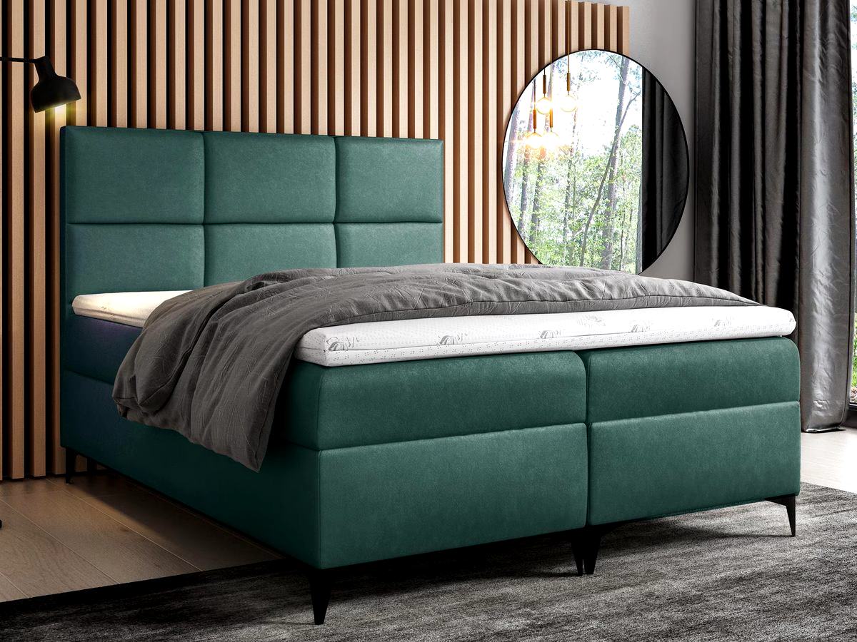 Prezentowany model wyróżnia się dekoracyjnie przeszywanym pionowo wezgłowiem oraz ciekawym połączeniem 2 kolorów. Posiadamy do zaoferowania kilka rozmiarów, a mianowicie 140×200, 160×200, 180×200 oraz 200×200. Ponadto budowa prezentowanego łóżka składa się z 3 segmentów. Najniższy stanowi wysoka funkcjonalną skrzynie z 2 oddzielnymi pojemnikami na pościel. Wyżej znajduje się materac sprężynowy, a na wierzchu umieszczono dodatkowy topper nawierzchniowy dbający o pełen komfort i wygodę snu.