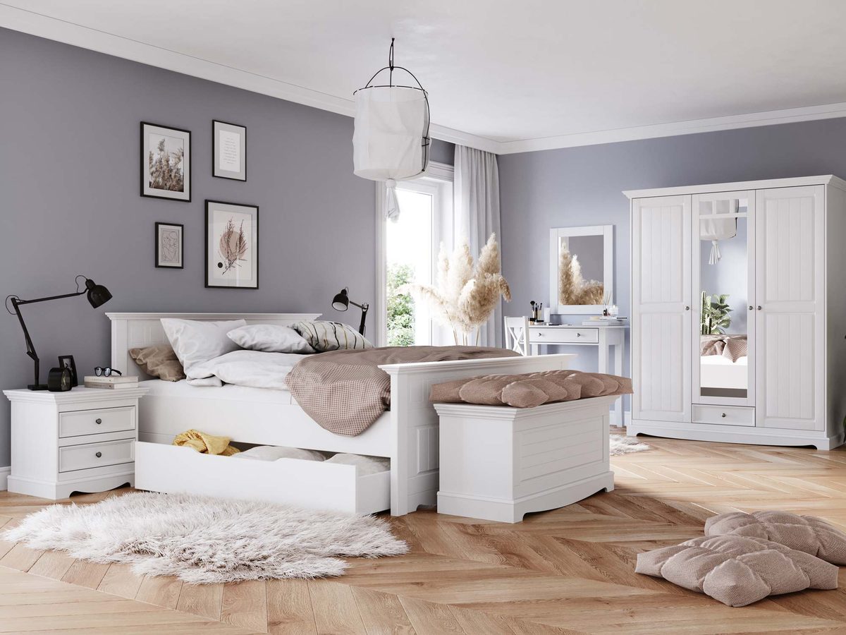 Romantyczne wnętrza w stylu francuskim to obecnie prawdziwy hit. Francuskie wnętrza można rozpoznać przede wszystkim po dużej ilości przestrzeni, jasny, kremowych barwach i dodatkach, których nie ma zbyt wiele, jednak są bardzo eleganckie. Ciekawym wyborem do takiego wnętrza bez wątpienia będzie białe łóżko drewniane z reprezentacyjnym wezgłowiem. Do tego komoda i szafki nocne na stylizowanych nóżkach i piękna sypialnia w stylu francuskim będzie gotowa. Przy urządzaniu białej sypialni w romantycznym stylu francuskim należy pamiętać o zachowaniu lekkości i byciu subtelnym. Nadmiar użytych wzorów lub kwiatów może przytłoczyć wnętrze.