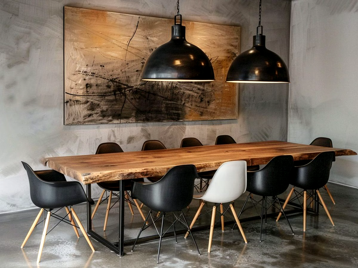 Charakter industrialny wnętrz to połączenie surowości materiałów i funkcjonalności. Drewniane meble w zestawieniu z metalowymi elementami, betonowymi blatami oraz odsłoniętymi instalacjami tworzą przestrzeń przypominającą lofty miejskie. W tym stylu dominują ciemniejsze odcienie drewna, które kontrastują z chłodnymi akcentami nowoczesnych materiałów.