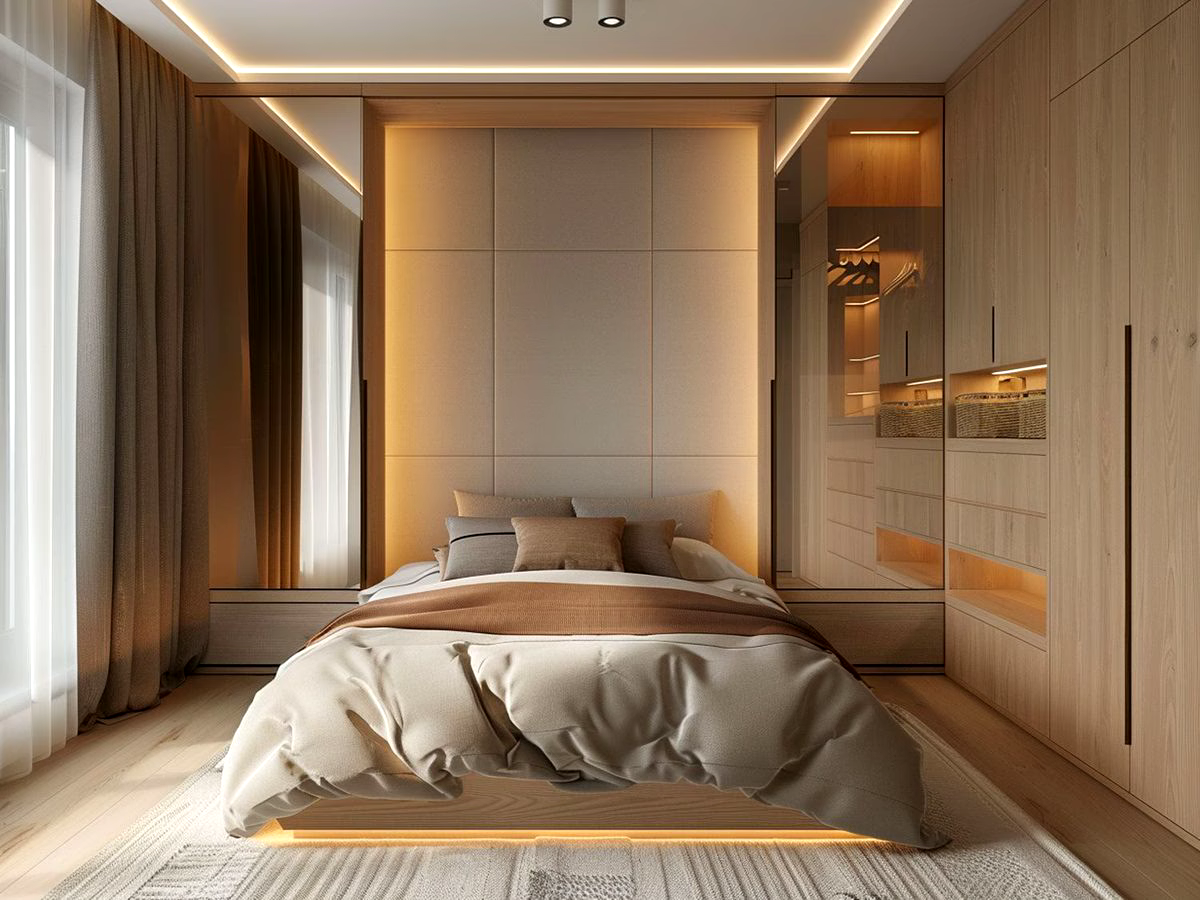 - Luksusowa sypialnia z akcentami nowoczesności: Elegancja i wyrafinowanie, podkreślone wysokiej klasy materiałami oraz inteligentnymi rozwiązaniami technologicznymi.