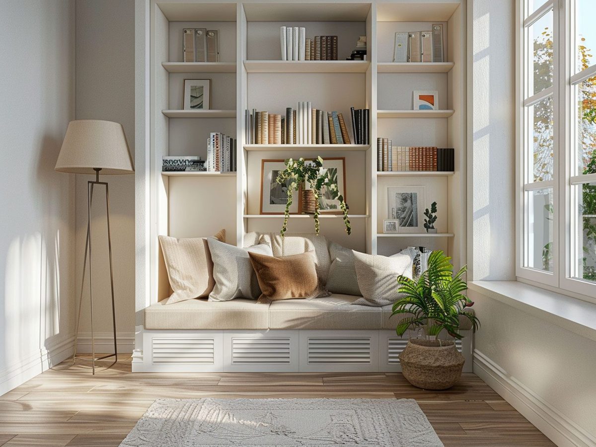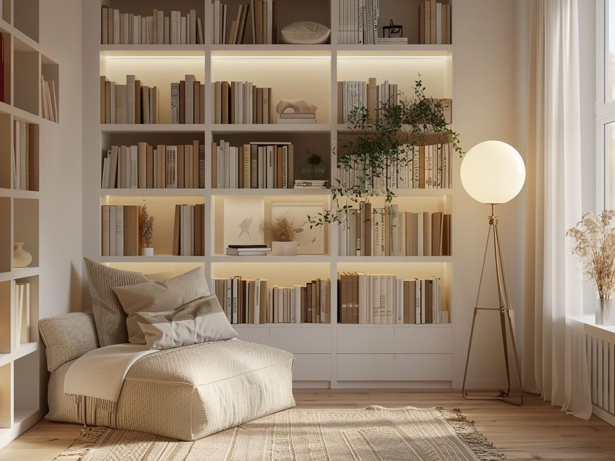 Nowoczesna biblioteka z jasnymi meblami, roślinami i minimalistycznym stylem