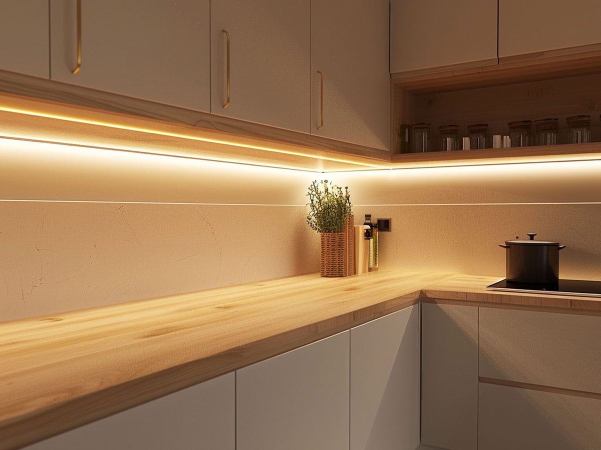 - Łatwość montażu: Listwy LED można zainstalować pod szafkami lub nad blatem, tworząc dyskretną i nowoczesną instalację świetlną.