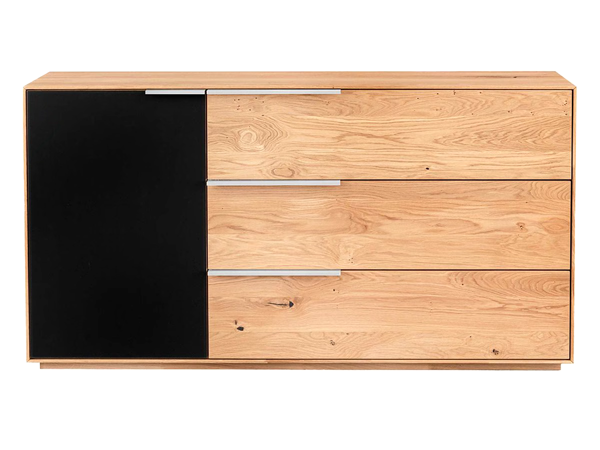Siłą modelu Arella jest hybrydowa konstrukcja. Połączenie trzech pojemnych szuflad z zamykaną szafką (z półką w środku) daje nieskończone możliwości organizacyjne. W szufladach schowasz drobnicę, bieliznę stołową czy dokumenty, natomiast szafka to idealne miejsce na wyższe przedmioty – wazony, karafki, zastawę stołową czy kolekcję płyt winylowych. Asymetryczny układ frontów wprowadza dynamikę do wnętrza, przełamując monotonne linie. Mebel wykonany w całości z litego drewna jest ciężki i stabilny, co jest szczególnie ważne w domach, w których są małe dzieci – ryzyko przewrócenia takiej konstrukcji jest minimalne.