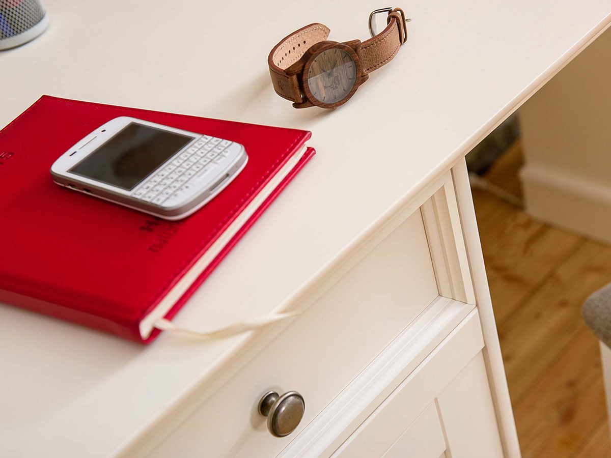 Co najistotniejsze prezentowane biurko INGRID został zaprojektowany i wyprodukowany z dbałością o każdy szczegół. Subtelne frezy, podstawa o niekonwencjonalnym kształcie oraz solidny blat tworzy niepowtarzalny mebel do sypialni, gabinetu czy biura. Przede wszystkim biurko zostało wykonane z drewna sosnowego fińskiego, co bezsprzecznie jest zapewnieniem najwyższej jakości oraz trwałości. Co więcej szuflada pozwala na przechowywanie drobniejszych rzeczy, a jej podwojenie w prezentowanym meblu zapewnia doskonałą organizację. Dodatkowo dwie duże przestrzenie to dodatkowa przestrzeń na przechowywanie, co bez wątpienia jest kolejnym atutem. Wyjątkowe uchwyty w kolorze starego srebra niezaprzeczalnie dodają niepowtarzalnego klimatu na styl vintage, a zastosowanie prowadnic z cichym domykiem ułatwiają użytkowanie. Ponadto korpus biurka drewnianego INGRID został pokryty ekologiczną farbą wodną (krycie 85%) o odcieniu ciepłej bieli.