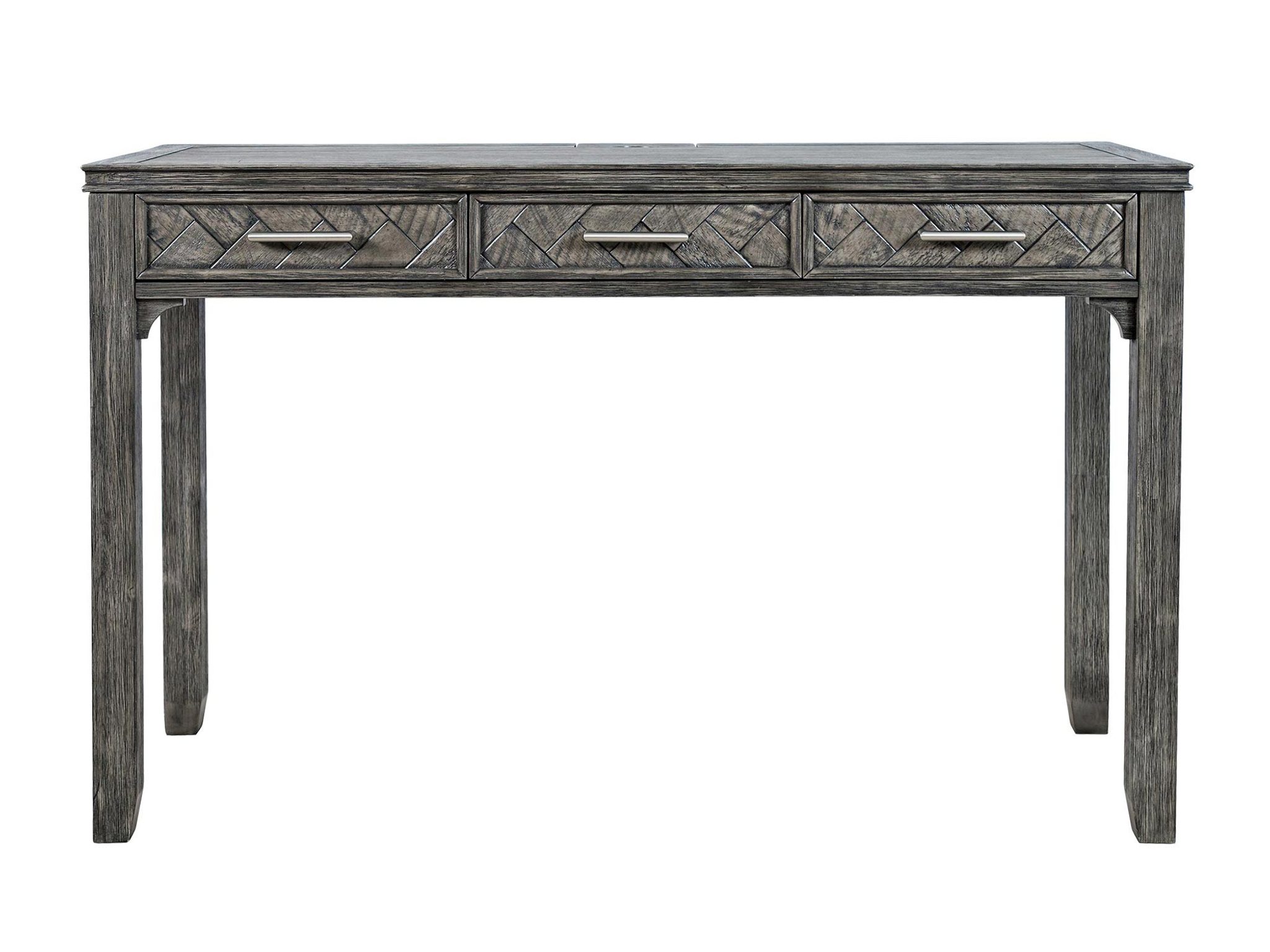 Biurko w stylu klasycznym w kolorze ciemnoszarym. Funkcjonalne szuflady z intarsją oraz wbudowane gniazdo i porty usb.