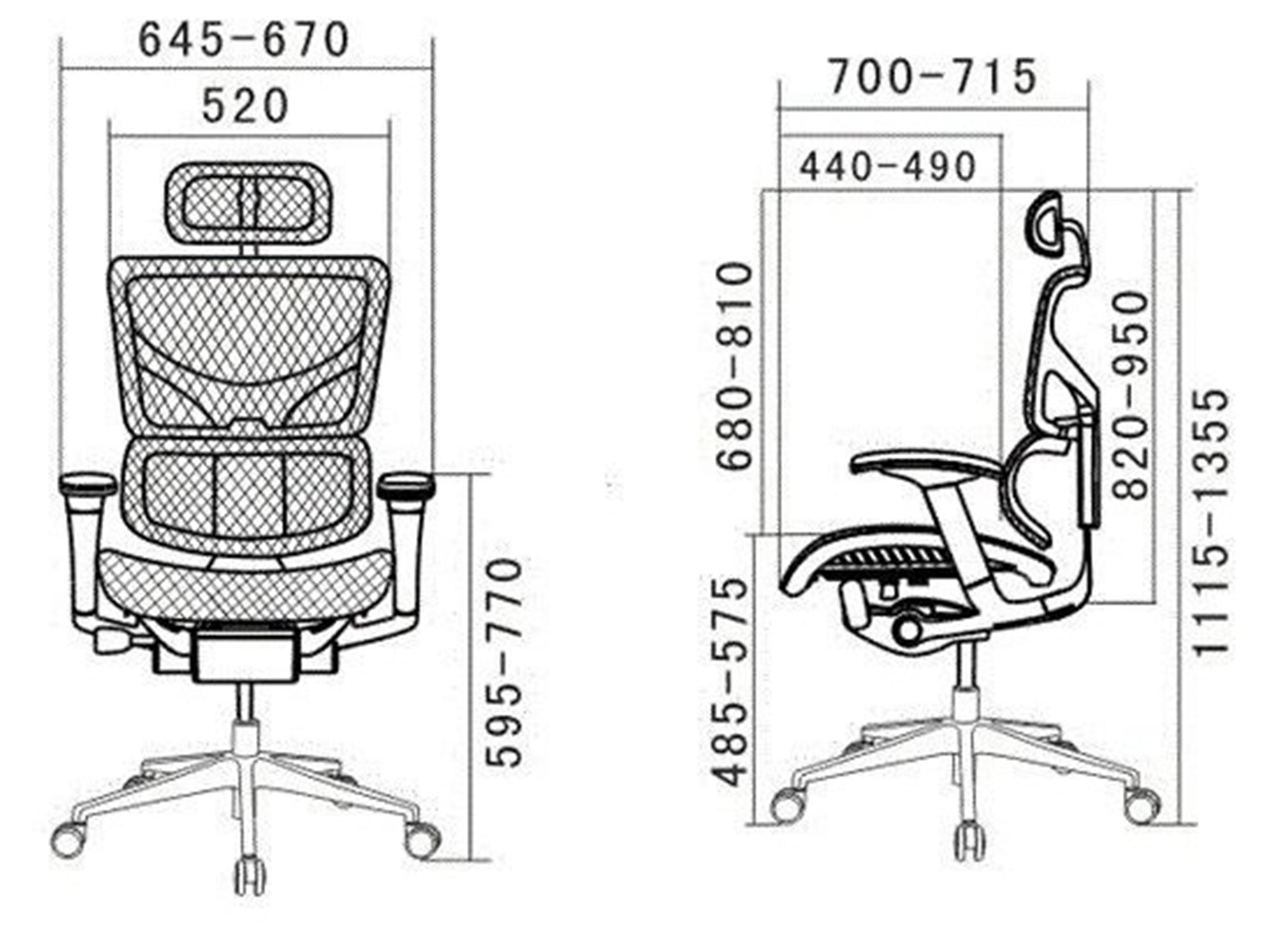 - Regulacje: wysokości, głębokości siedziska, zagłówka, lędźwi, podłokietników
