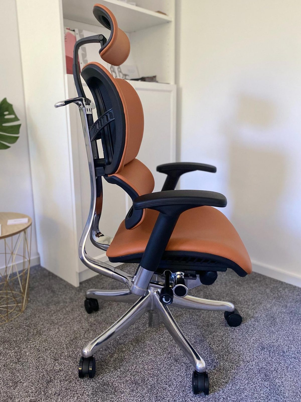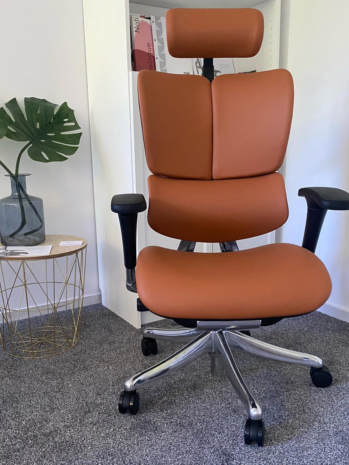 Karmelowy fotel biurowy ergonomiczny skórzany w aranżacji biura