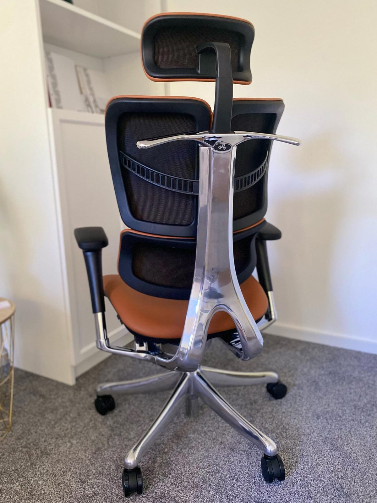 Karmelowy fotel biurowy ergonomiczny widok z tyłu konstrukcja