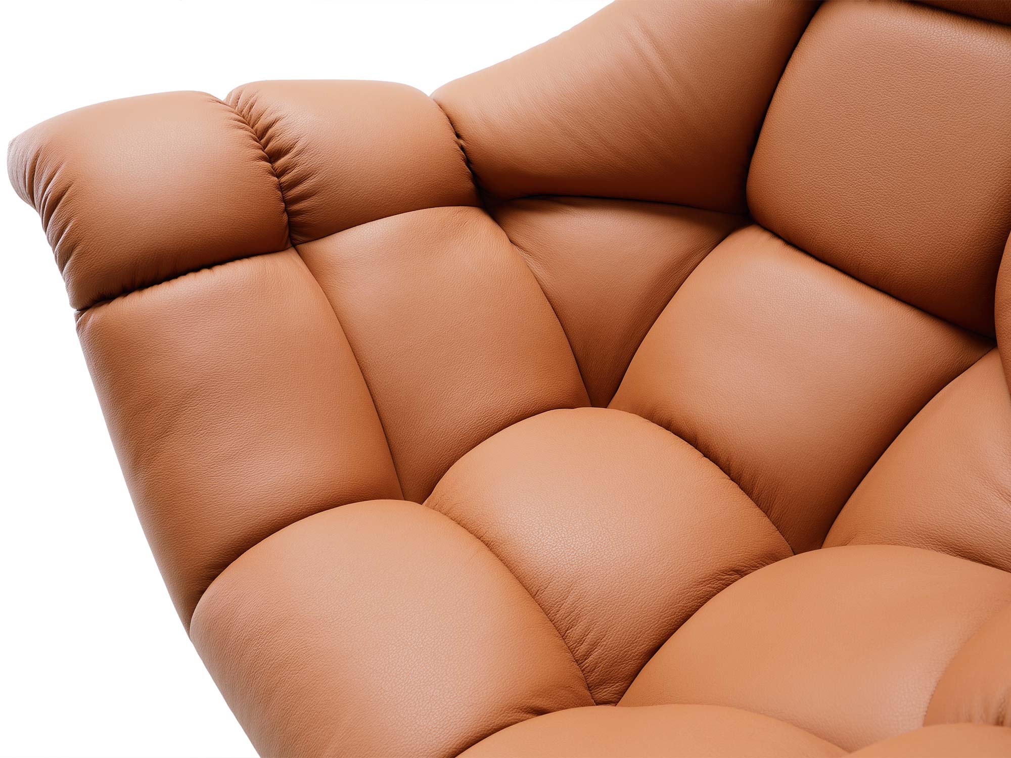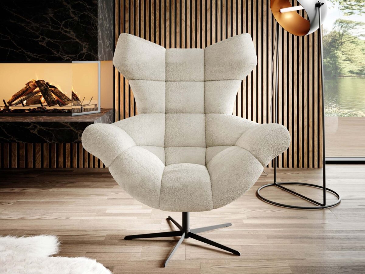 Materiały i wykończenie. Tapicerka dostępna jest w wersji ze skóry naturalnej lub z wyselekcjonowanych tkanin premium (w zależności od konfiguracji), co ułatwia dopasowanie fotela do stylistyki wnętrza i trybu życia domowników. Stabilna, metalowa podstawa w formie krzyżaka zapewnia pewne oparcie oraz atrakcyjny, designerski akcent. Dzięki wysokiemu prześwitowi pod meblem łatwiej utrzymać czystość.