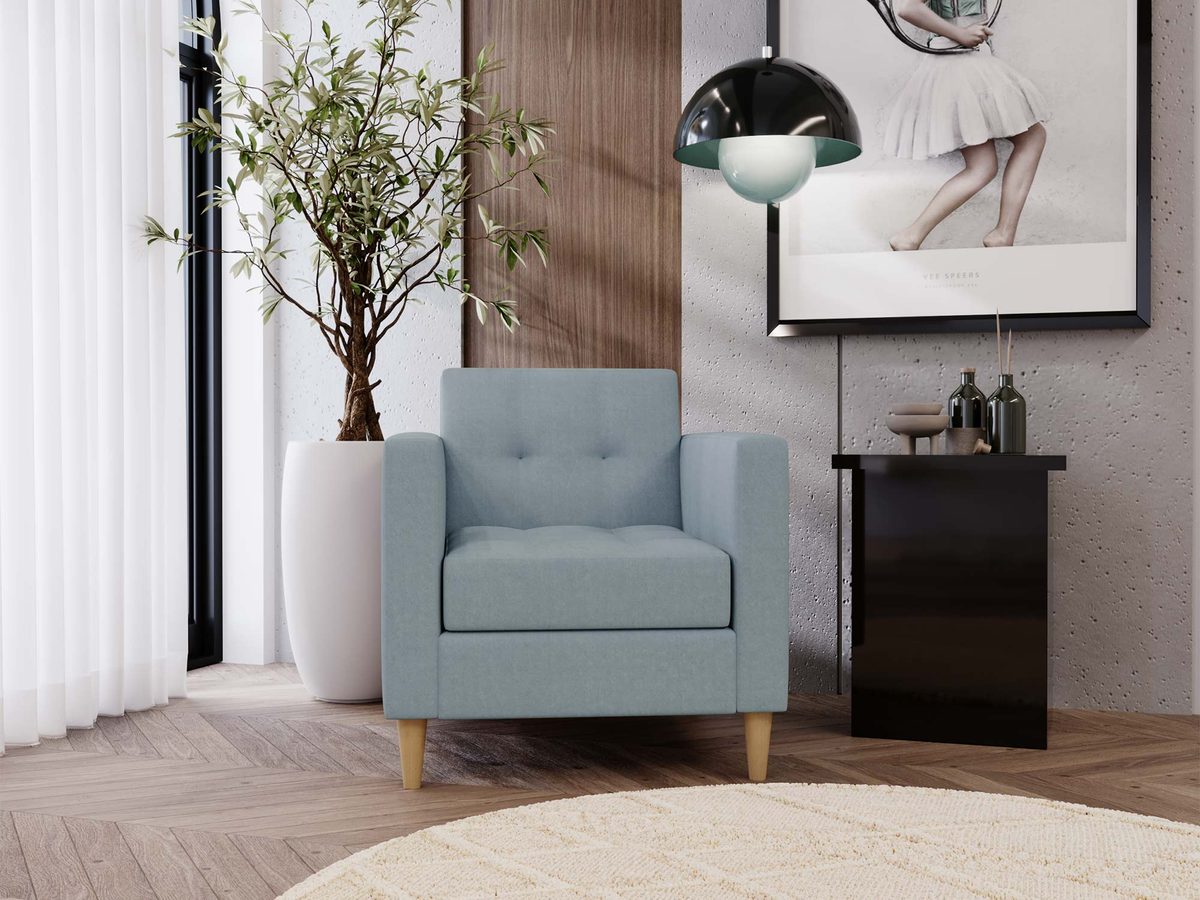 Niebieski fotel tapicerowany z guzikami i drewnianymi nogami w aranżacji salonu