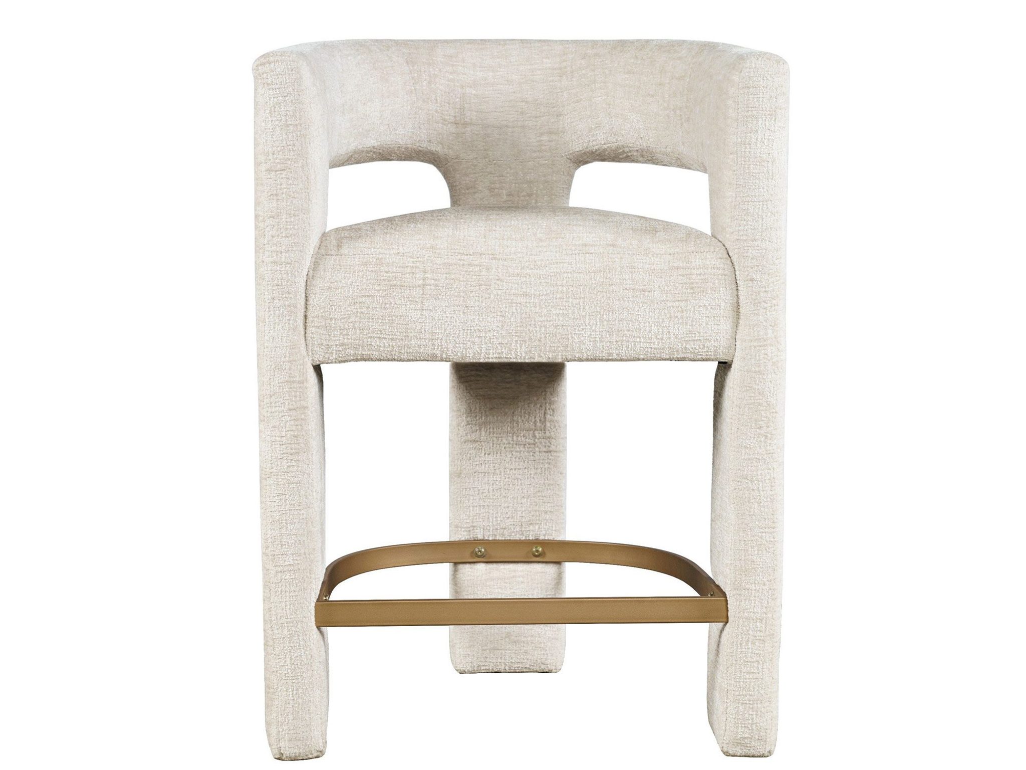 Eleganckie krzesło barowe tapicerowane w kolorze jasnobeżowym wykonane z najwyższej jakości tkaniny szenilowej. Prosta forma mebla oparta na modnych obłych kształtach wzbogaci każdą jadalnię.