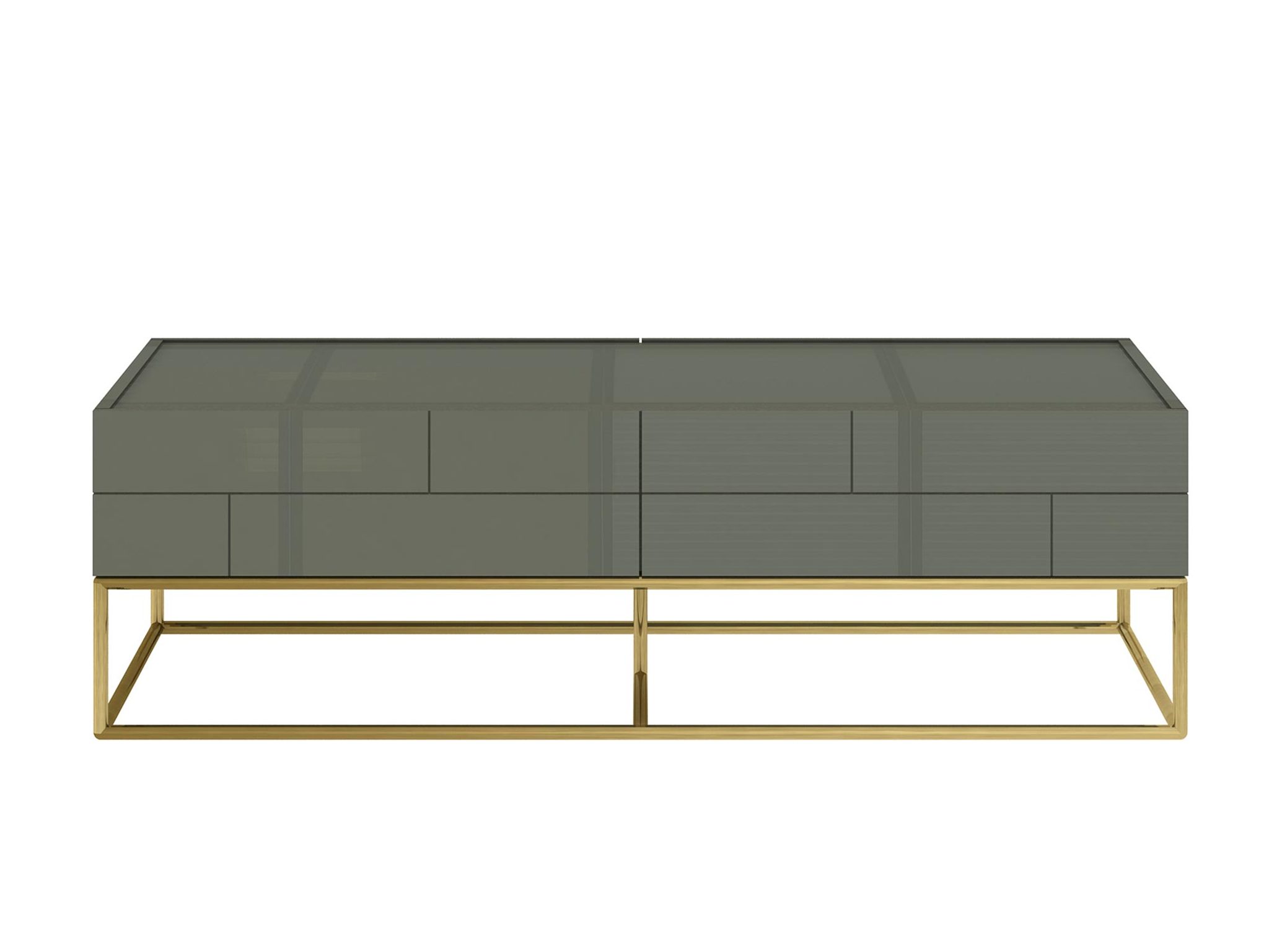 „Blossom Grove” to ława, która wyróżnia się elegancją i nowoczesnym stylem. Blat w kolorze cementowej zieleni o wysokim połysku doskonale łączy się z nogami w kolorze złota, wykonanymi z wysokiej jakości stali nierdzewnej. Korpus z płyty MDF o wysokim połysku zapewnia trwałość i łatwość w utrzymaniu czystości. Fronty 3D w połączeniu z minimalistyczną formą bryły tworzą harmonijną całość, która pasuje do wielu wnętrz. Ława jest również wyposażona w system soft close, co zapewnia płynne i ciche otwieranie i zamykanie.