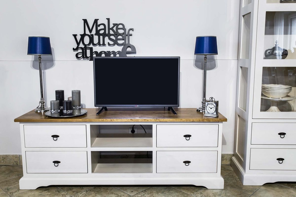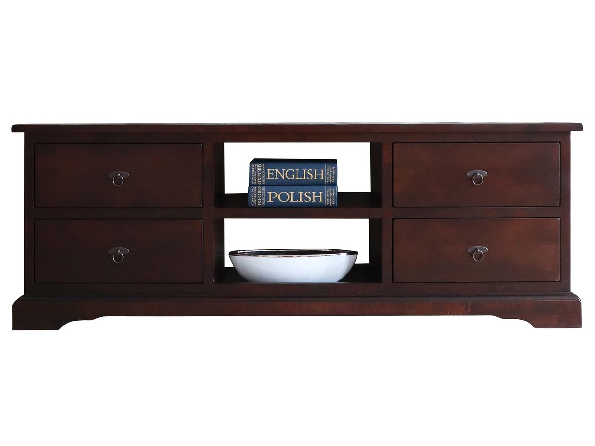 Oferowana podłużna szafka RTV z drewna brzozowego LOGAN to mebel, który doskonale sprawdzi się we wnętrzu salonu. Ponadto w standardzie szafka posiada 2 praktyczne głębokie otwarte półki, które pomieszczą sprzęt audio lub dekoder, a 4 pojemne szuflady będą idealną skrytką dla filmów, albumów i płyt. Istnieje możliwość zamówienia z szafki z pełnymi plecami (inna cena) lub możliwość wykonania 3 szuflad na dole i 3 półek na górze (inna cena). Estetyczne połącznie drewna brzozowego lub dębowego z metalowymi uchwytami nadaje szafce wykwintnego stylu. Ten utrzymany w rustykalnym stylu mebel cechuje solidne wykonanie, a wykorzystane materiały reprezentują najwyższą jakość. Klasyczny wygląd tego mebla stoi w parze z jego funkcjonalnością. Wybierając ten mebel można być pewnym, że nie tylko stylowo uzupełni wnętrze salonu, ale także zaskoczy swoją praktycznością.