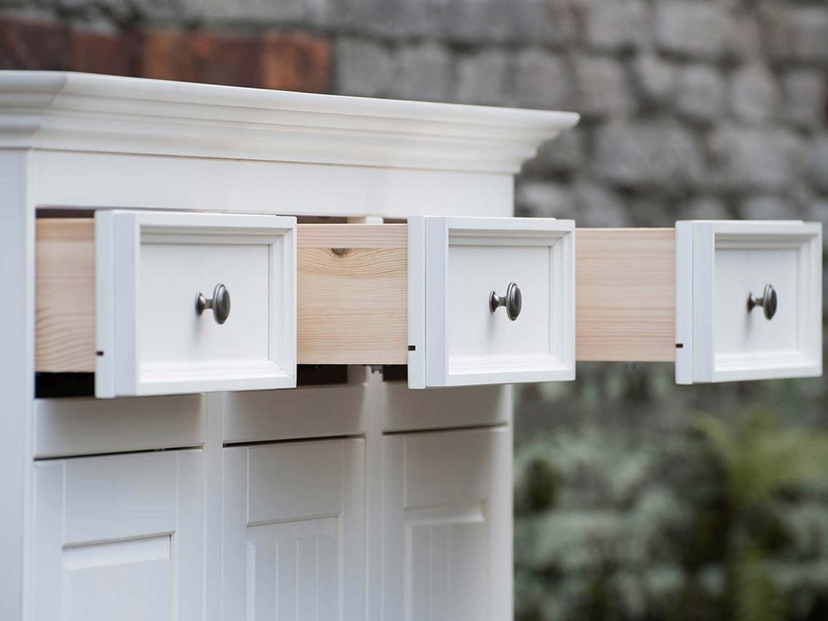 Biała klasyczna komoda drewniana szuflady otwarte INGRID