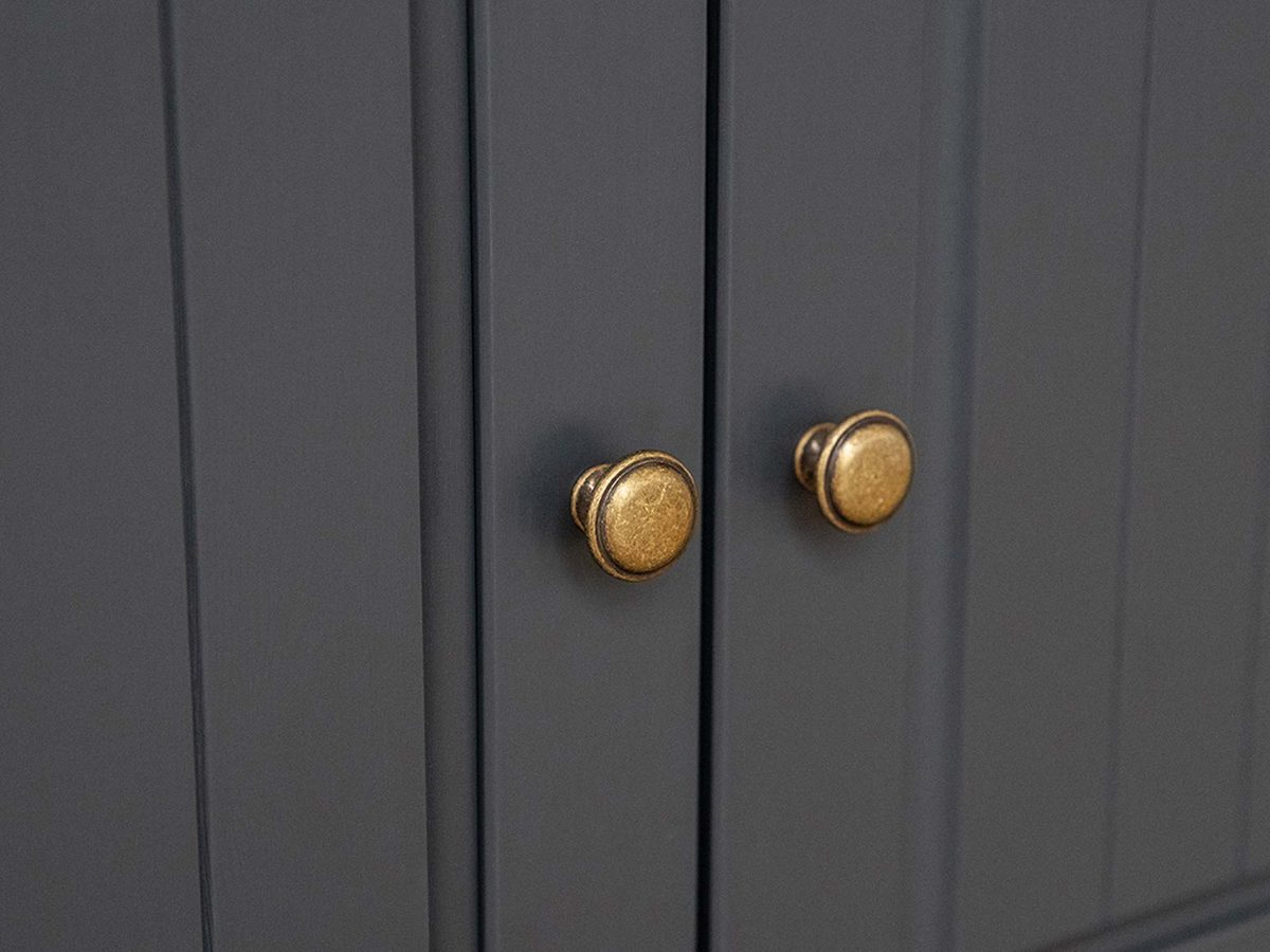 Co najważniejsze wykonanie mebla z drewna gwarantuje trwałość na długie lata. Co więcej klasyczna bryła, unikalne frezy dodające meblu charakter tworzą mebel uniwersalny, niemalże nigdy nie wychodzący z mody. Ponadto charakterystyczne uchwyty w kolorze starego złota nadają meblu wyjątkowości oraz charakteru vintage. Dodatkowo komoda posiada trzy pojemne szuflady, gdzie można przechowywać drobniejsze rzeczy oraz trzy duże przestrzenie z półkami, gdzie można przechowywać domową zastawę, koce czy dokumentu biurowe, w zależności od umiejscowienia. Subtelne frezy na drzwiach oraz ozdobna listwa dolna tworzą unikalny mebel do każdego klasycznego wnętrza.