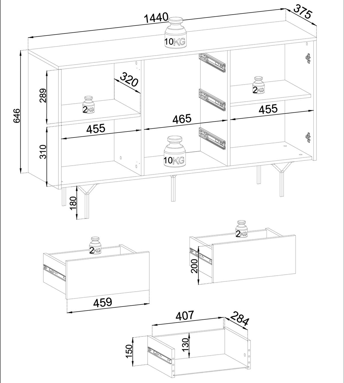 - Korpus i szuflady wykonane z płyty laminowej 16 mm, obrzeże zabezpieczone ABS.