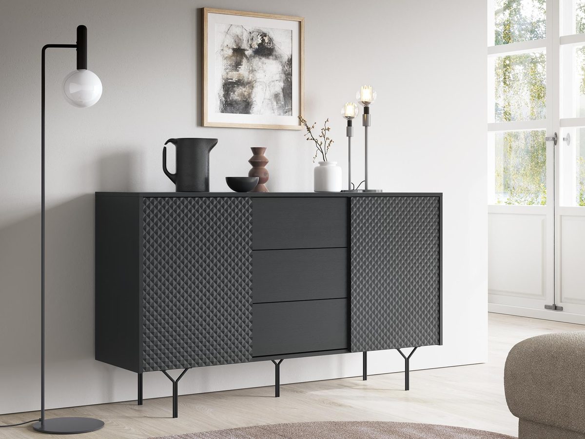 Zaprezentuj swojemu wnętrzu nową definicję stylu z Czarna Komoda Kruk 144cm. Ten wyjątkowy mebel wyróżnia się nie tylko nowoczesnym designem, ale również zaawansowanymi rozwiązaniami technologicznymi. Frezowany front wykonany w technologii 2D w połączeniu z głęboką czernią grafitową korpusu i eleganckimi stalowymi nogami tworzy mebel, który jest zarówno funkcjonalny, jak i niezwykle dekoracyjny.
