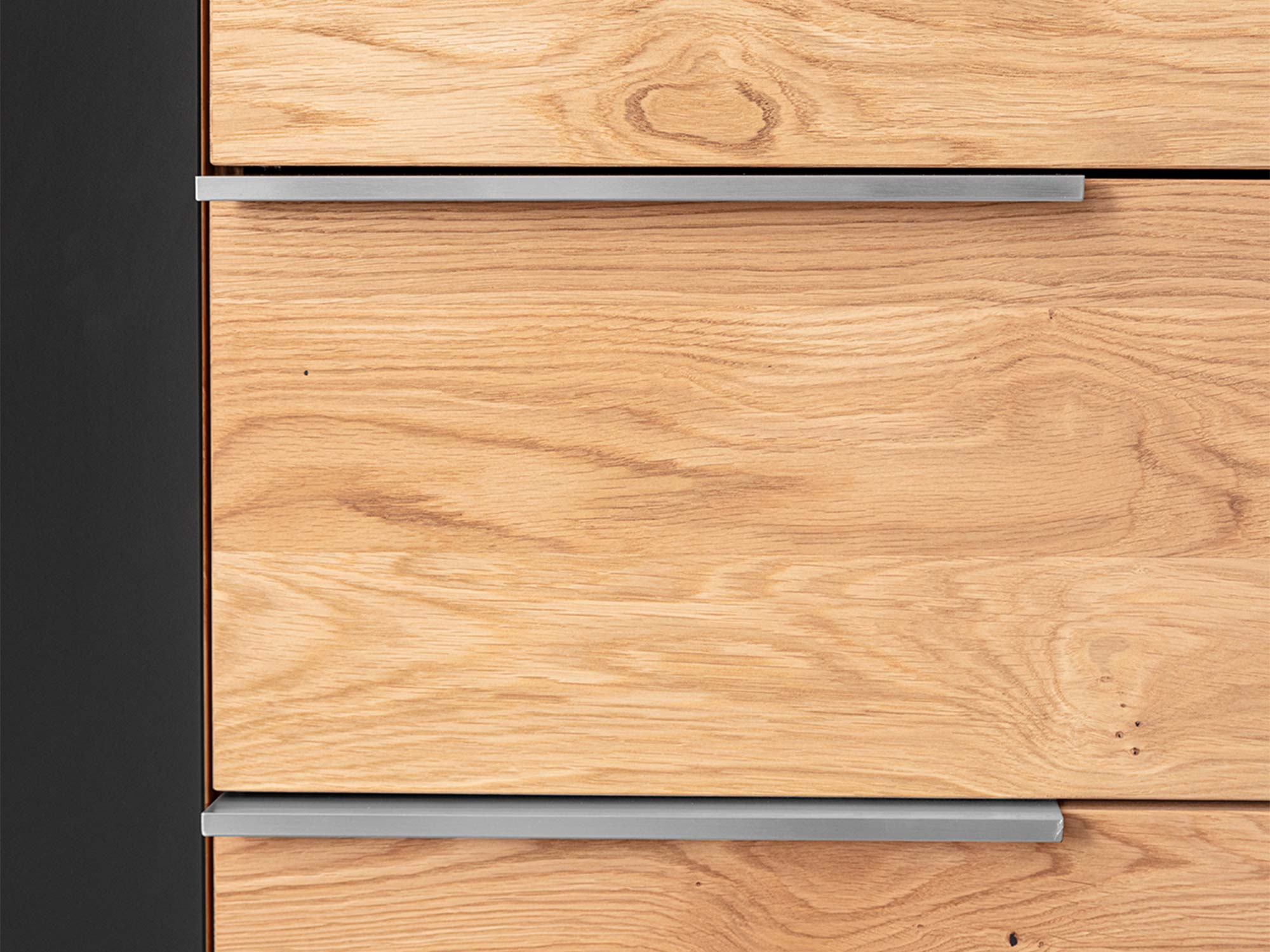 Eleana 1T3L powstała z myślą o osobach, które cenią porządek i wyrafinowaną prostotę. Korpus i fronty z litego dębu prezentują naturalny rysunek słojów – każdy egzemplarz jest unikatowy. Wykończenie olejem/olejowoskiem (bezbarwnym) podkreśla głębię drewna, zapewnia przyjemny, satynowy dotyk i ułatwia pielęgnację, a w razie potrzeby pozwala na delikatne odświeżenie powierzchni.