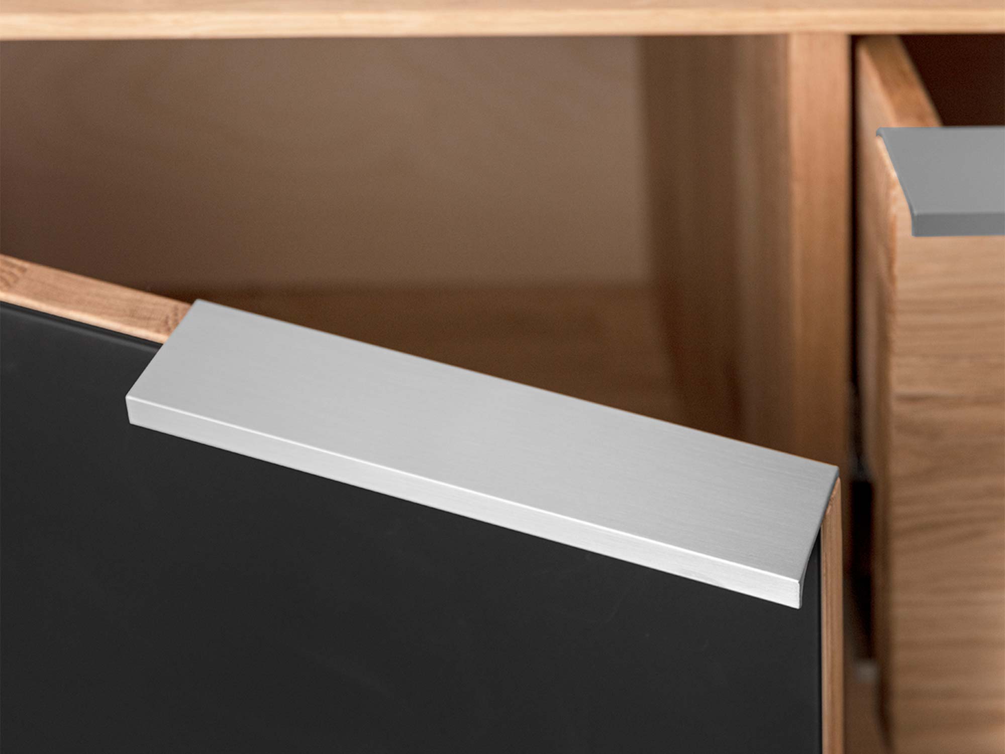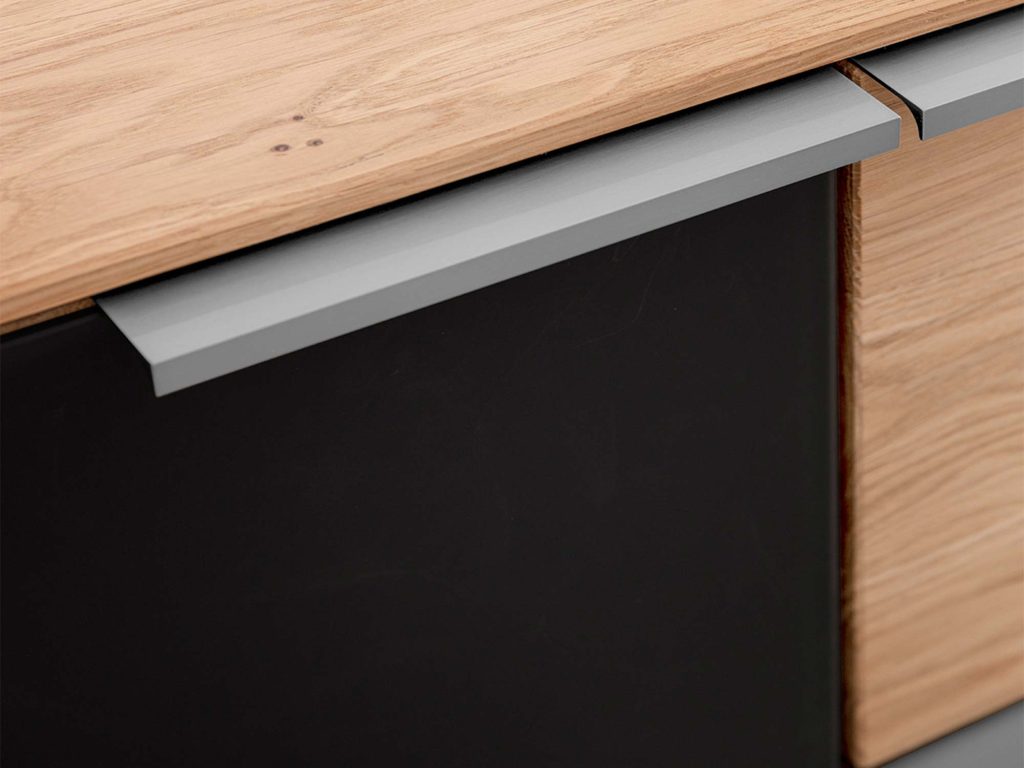 Za kulturę pracy odpowiadają prowadnice i zawiasy z cichym domykiem Softclose (BLUM). Otwierasz i zamykasz bez trzasków, bez wstrząsów dla zawartości – to komfort, który docenisz zarówno w porannym pośpiechu, jak i wieczornej ciszy. Smukłe metalowe uchwyty dopełniają całości: są wygodne, odporne na codzienne użytkowanie i idealnie współgrają z antracytowym szkłem oraz naturalnym dębem.