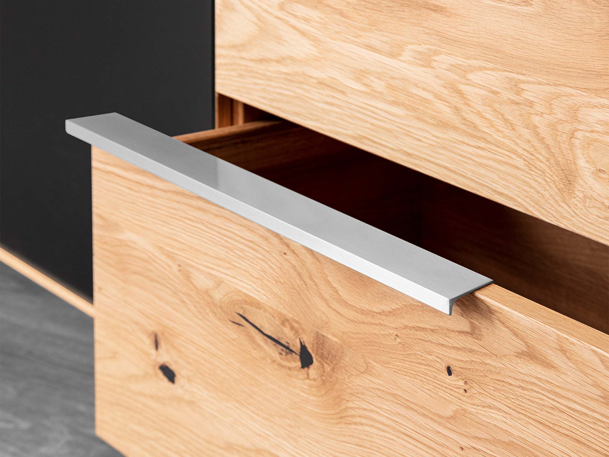 Projekt jest nowoczesny, ale nie chłodny. Minimalistyczny rysunek bryły, smukłe metalowe uchwyty i wyciszone okucia składają się na mebel, który po prostu dobrze pracuje każdego dnia. A gdy zechcesz zmienić klimat – wymień dodatki, a komoda nadal będzie „grać” z nowym wystrojem. Bo prawdziwe drewno jest ponadczasowe.
