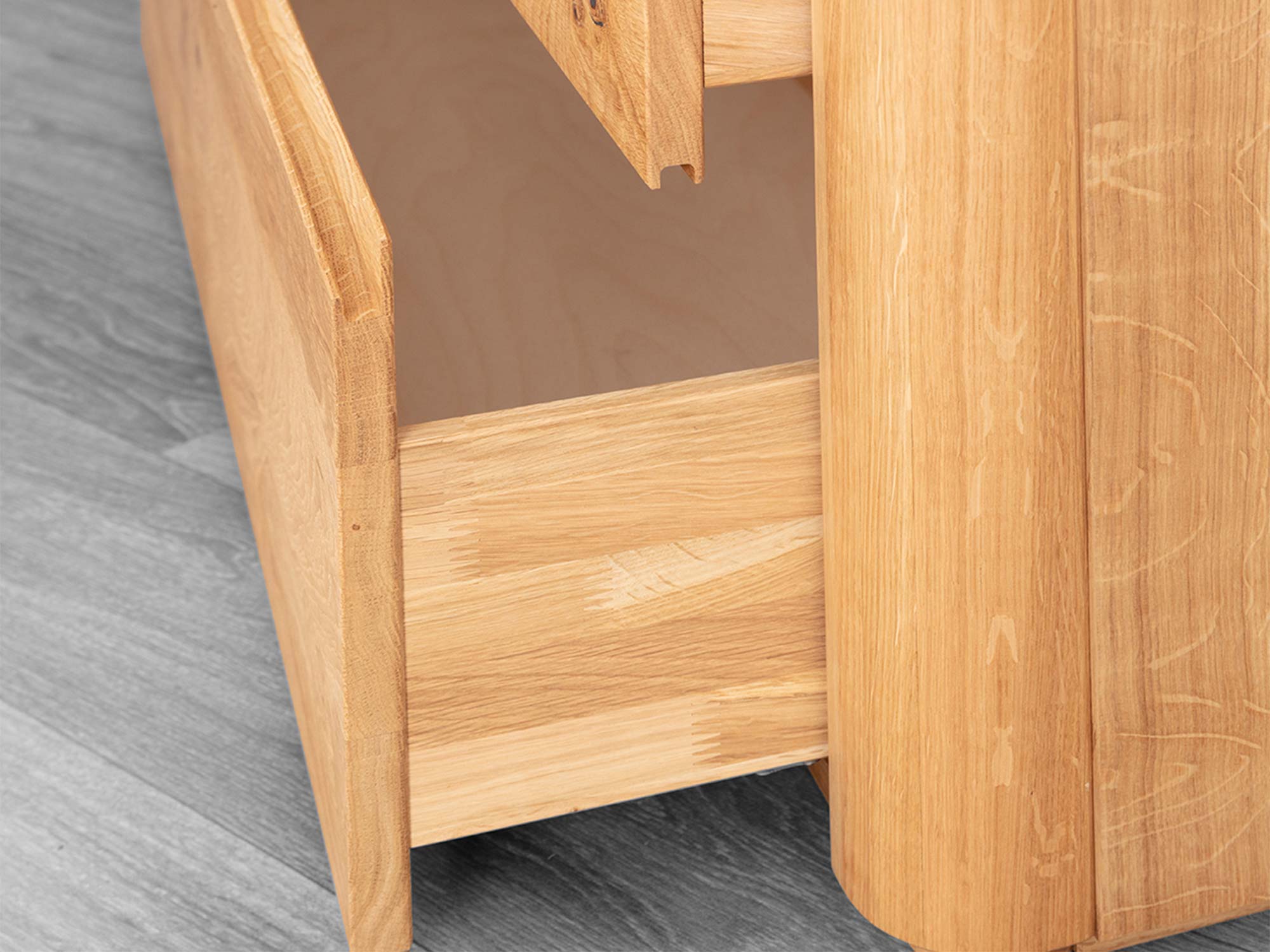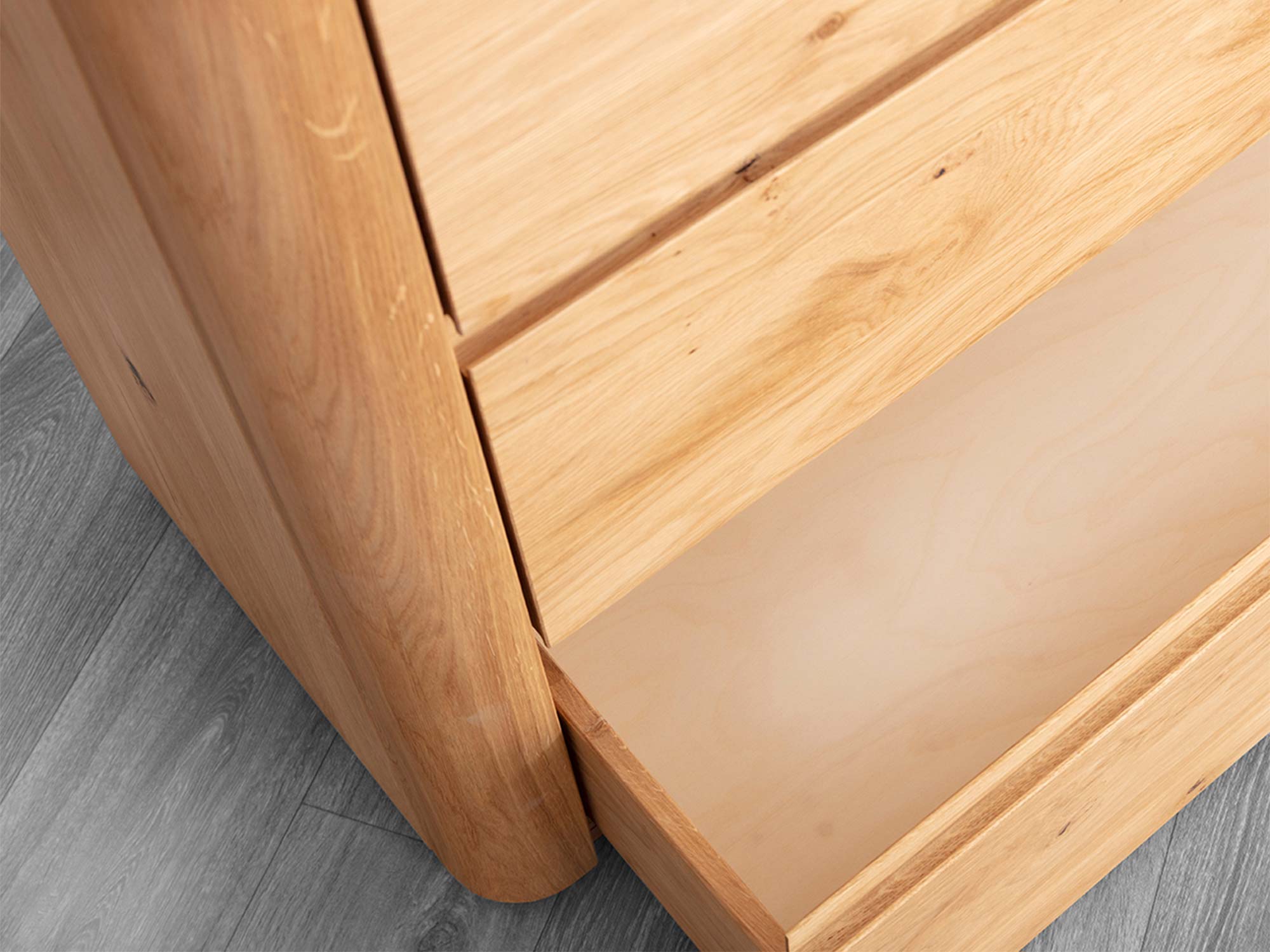 Najbardziej charakterystycznym elementem mebla są zaokrąglone fronty i boki, które nadają mu lekkości i organicznego charakteru. Dzięki temu komoda doskonale wpasowuje się w aranżacje inspirowane naturą – od stylu skandynawskiego, przez japandi, aż po klasyczne przestrzenie. To nie jest zwykły mebel – to harmonijny dodatek, który odmieni klimat całego wnętrza.
