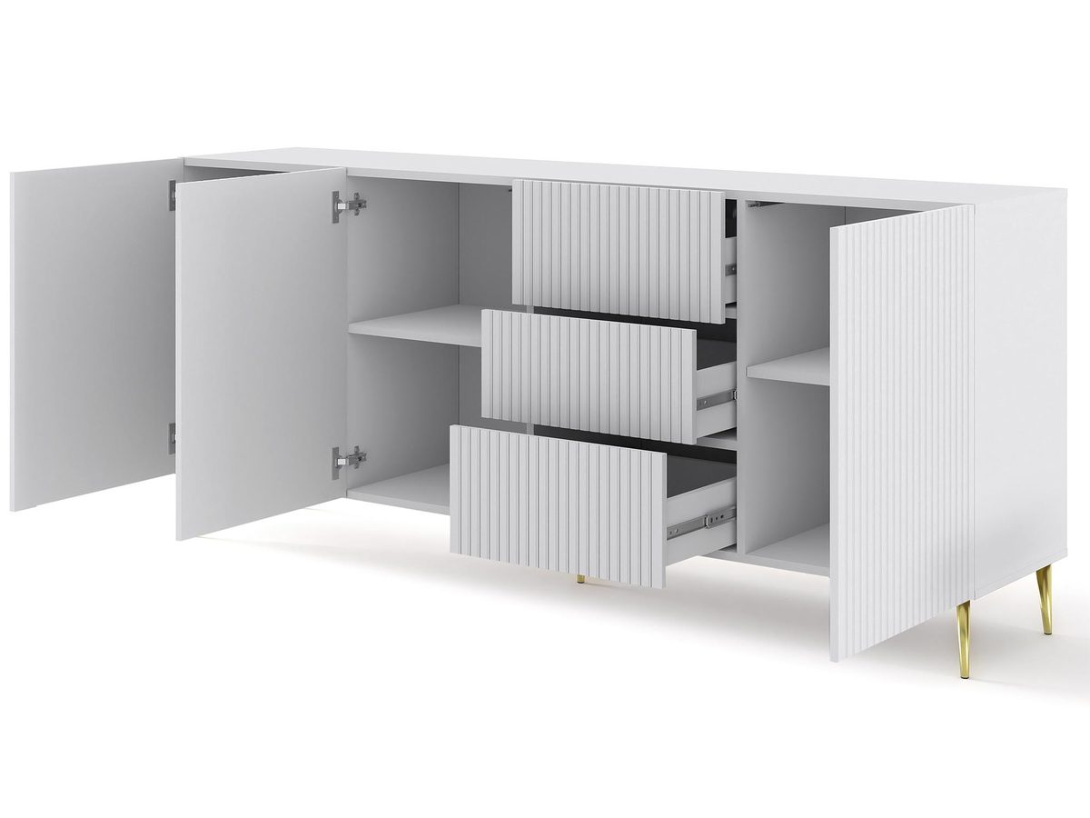 Duża Komoda Navia 200 cm z Nogami Szpilkami to mebel, który wprowadzi do Twojego wnętrza nowoczesność i elegancję. Biały matowy korpus i fronty nadają wnętrzu świeżości i lekkości, a złote nóżki dodają mu luksusowego charakteru. Dzięki temu komoda Navia będzie doskonałym uzupełnieniem zarówno minimalistycznych, jak i bardziej klasycznych aranżacji, wnosząc do nich odrobinę nowoczesnego stylu. Wybierz Dużą Komodę Navia 200 cm z Nogami Szpilkami i ciesz się pięknym oraz praktycznym meblem, który doda Twojemu wnętrzu nowoczesnego charakteru.