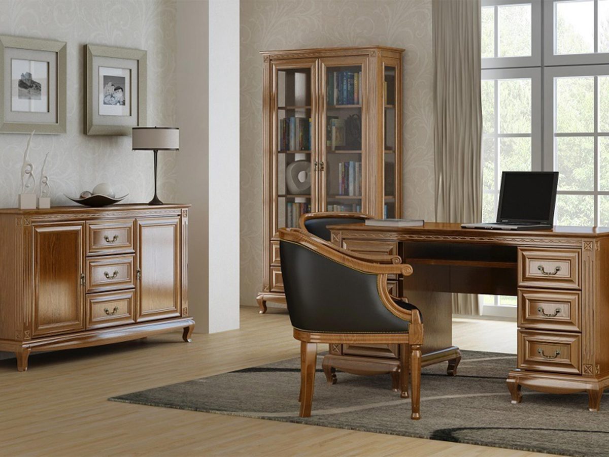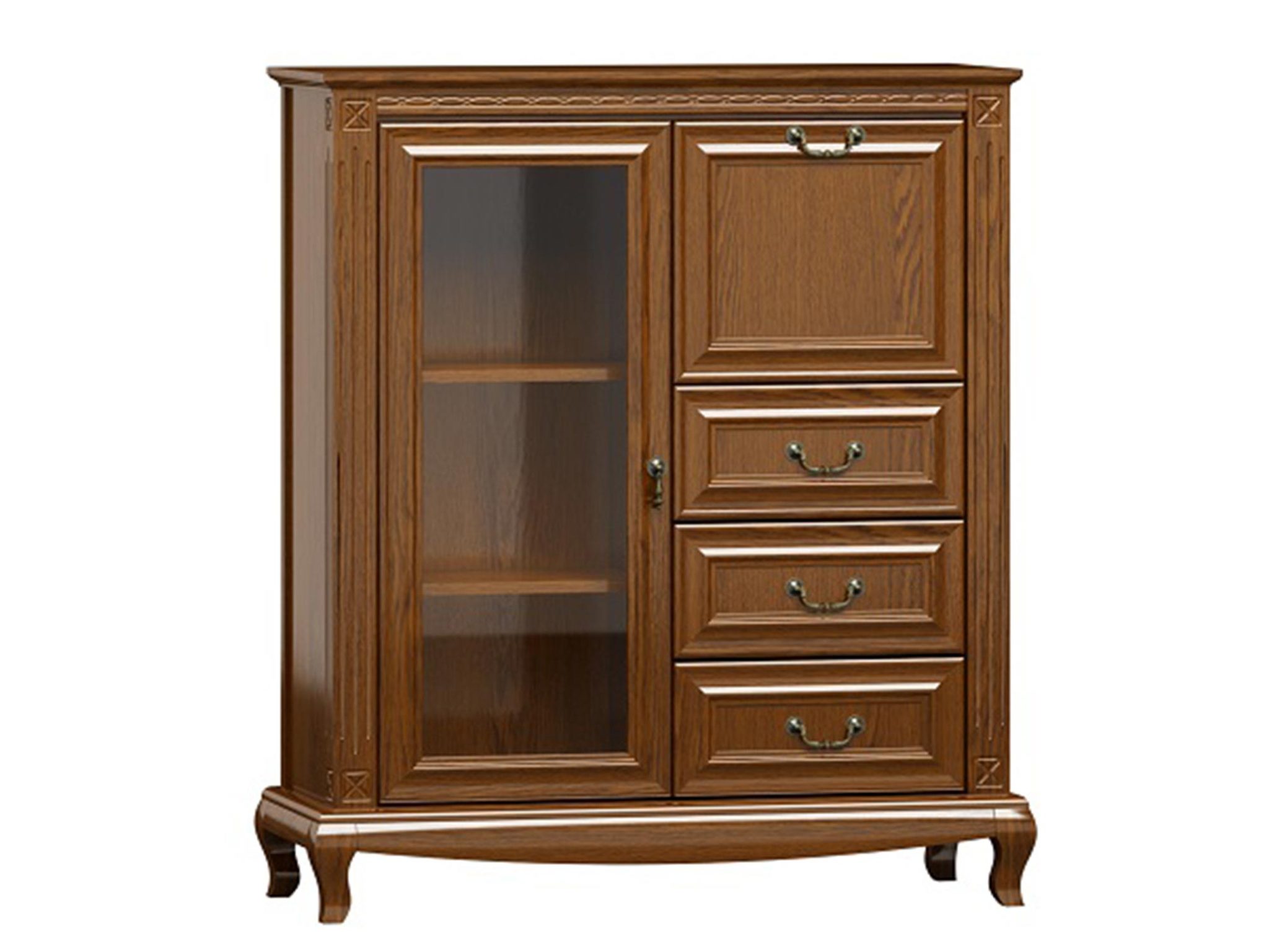 Drewniana komoda z rzeźbionymi nogami, eleganckimi uchwytami i klasycznym wykończeniem do stylowego wnętrza