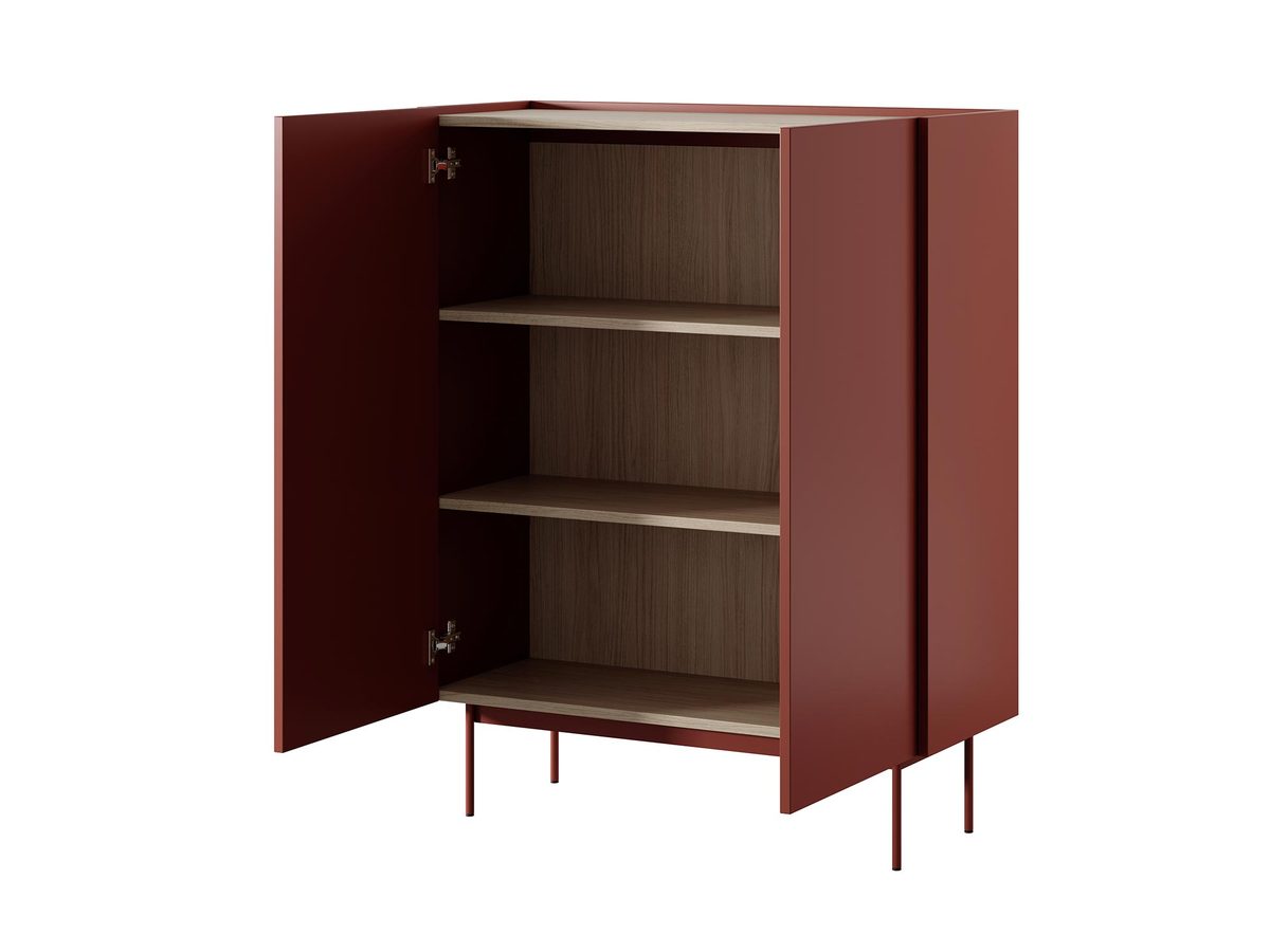 Czerwona komoda z otwartymi drzwiami i półkami, styl nowoczesny