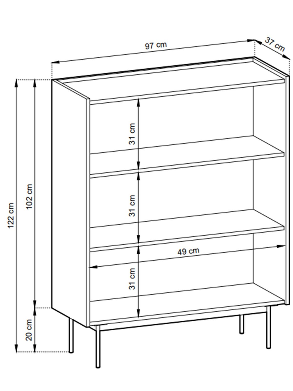 Rysunek techniczny komody z otwartymi półkami i metalowymi nogami