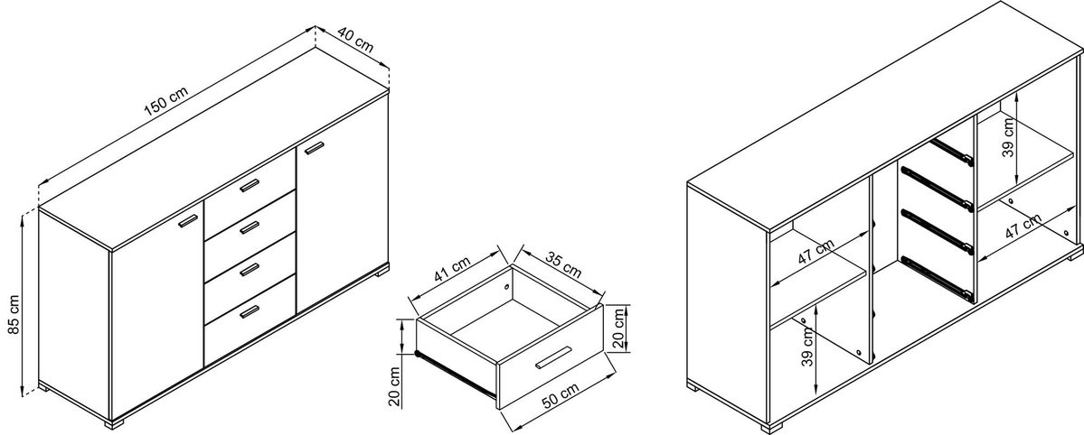 Szerokość: 150 cm / Wysokość: 85 cm / Głębokość: 40 cm