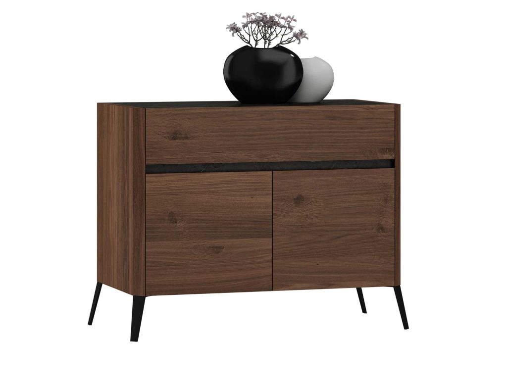 Komoda 2D1S Lumeria to kwintesencja elegancji i funkcjonalności w nowoczesnym wydaniu. Prosta, geometryczna forma została wzbogacona o ciepłe akcenty naturalnej okleiny w kolorze orzecha baltimore oraz dekoracyjny blat z szarego kamienia. Dzięki temu mebel staje się nie tylko praktycznym elementem wyposażenia, ale również luksusową ozdobą wnętrza.