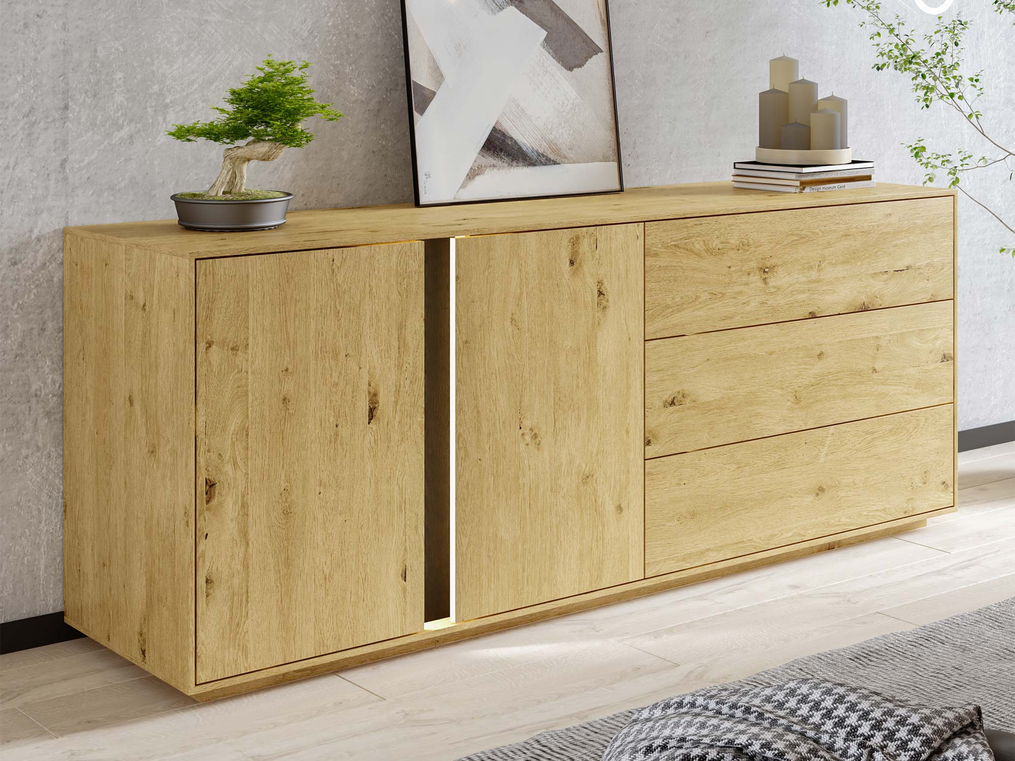 Korpus z pocienionych elementów nadaje konstrukcji lekkości, a naturalna okleina z elementami litego drewna gwarantuje trwałość i unikalny charakter. System push to open pozwala otwierać fronty lekkim dotknięciem, eliminując potrzebę uchwytów i podkreślając minimalistyczny styl. Jeśli chcesz dodać komodzie jeszcze więcej uroku, możesz wybrać oświetlenie LED (opcjonalnie, za dopłatą) – jego ciepła barwa przypomina blask żywego ognia i tworzy w pomieszczeniu wyjątkowy nastrój.
