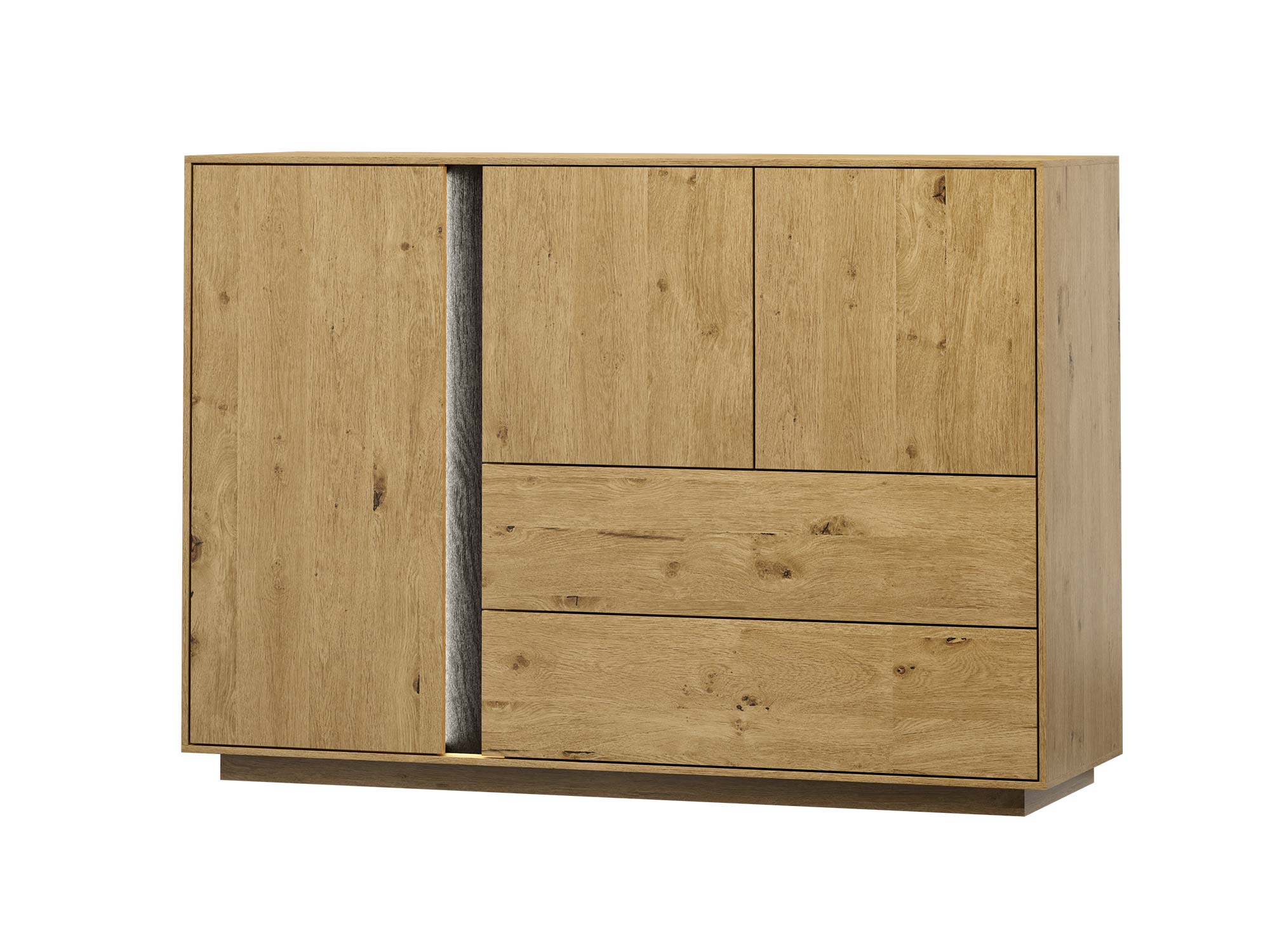 Korpus komody został wykonany z pocienionych elementów, co nadaje całości wizualnej lekkości i nowoczesnego charakteru. Z kolei fronty wykończono naturalną okleiną z elementami litego drewna, co gwarantuje trwałość, unikalny wygląd i ponadczasowy styl.