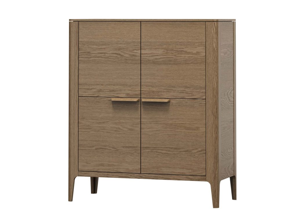 Naturalna okleina połączona z elementami litego drewna nadaje jej charakteru, a subtelne zaokrąglenia podkreślają nietuzinkowy styl. To mebel, który łączy w sobie praktyczność z luksusowym designem, tworząc wyjątkową przestrzeń do przechowywania i aranżacji.
