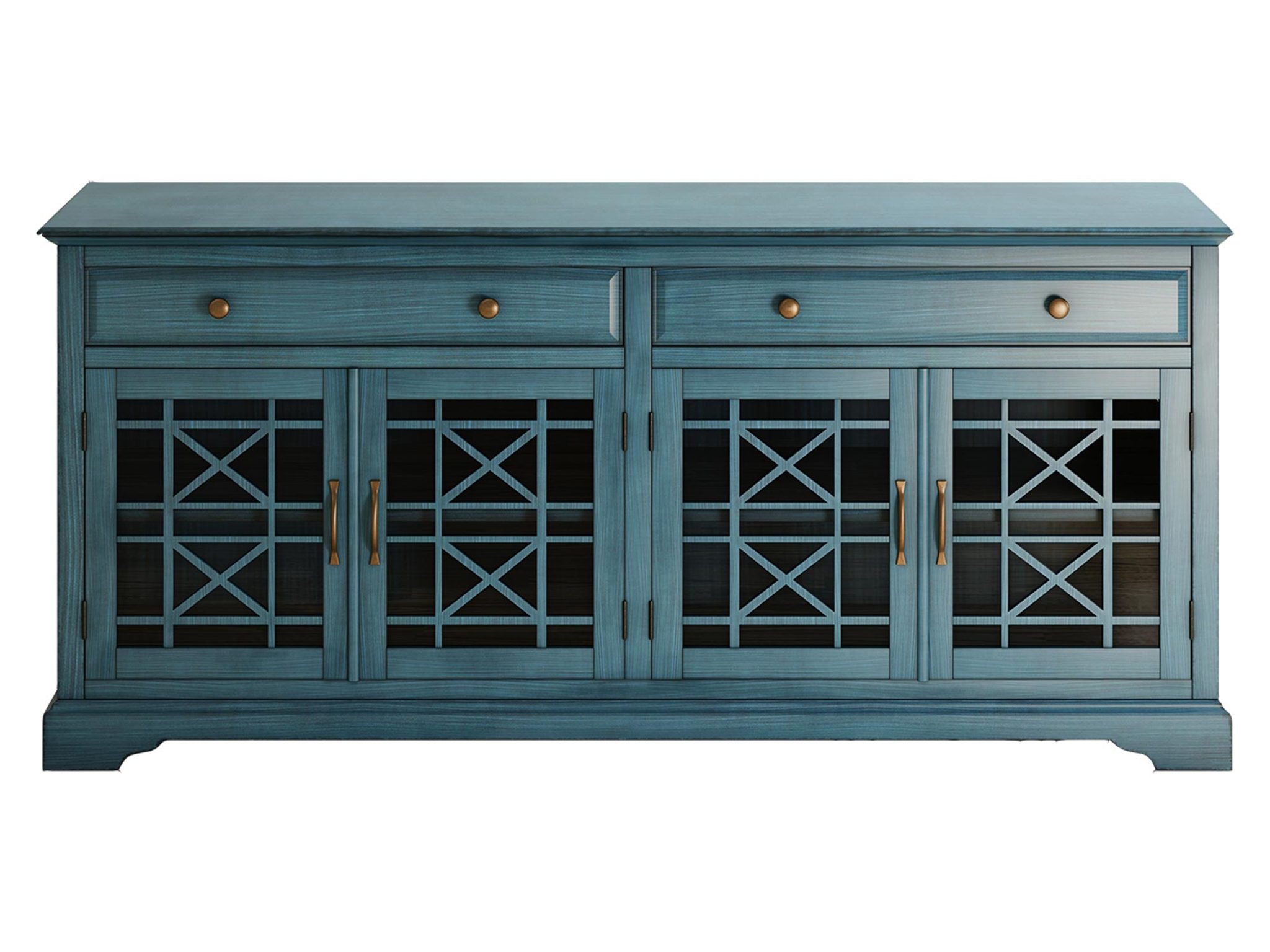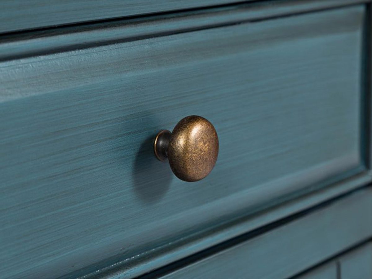 Elegancka komoda w Ciemnoniebieskim kolorze z subtelnymi przetarciami, idealna do wnętrz o klasycznym i rustykalnym charakterze. Wykonana z drewna akacji, komoda wyróżnia się solidnym wykonaniem oraz wyjątkowym wykończeniem, które nadaje jej charakteru. Subtelne przetarcia w połączeniu z ciemnym odcieniem drewna tworzą mebel pełen ciepła i elegancji. Doskonały wybór do salonów, sypialni czy przedpokojów.