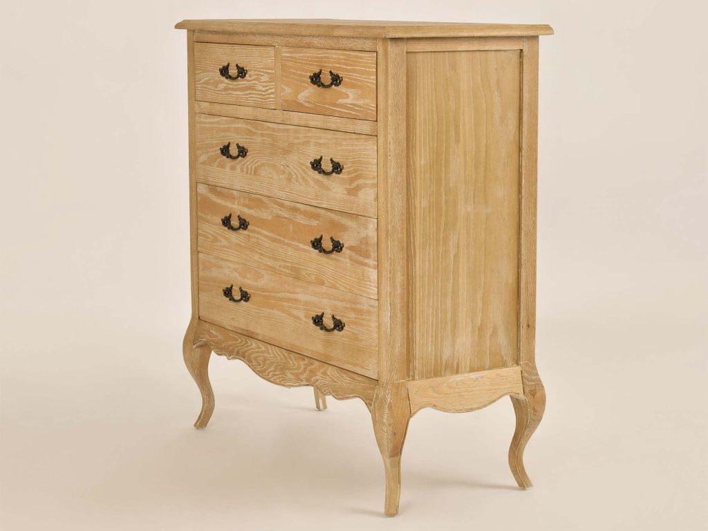 Stylowa komoda drewniana na giętych nogach, zaprojektowana w duchu francuskiego szyku. Naturalne, bielone drewno z widoczną strukturą łączy się z ozdobnymi, metalowymi uchwytami w kolorze ciemnego mosiądzu. Szczotkowana powierzchnia i delikatne przetarcia shabby chic nadają meblowi wyjątkowego uroku, który idealnie wpasuje się w każde wnętrze.