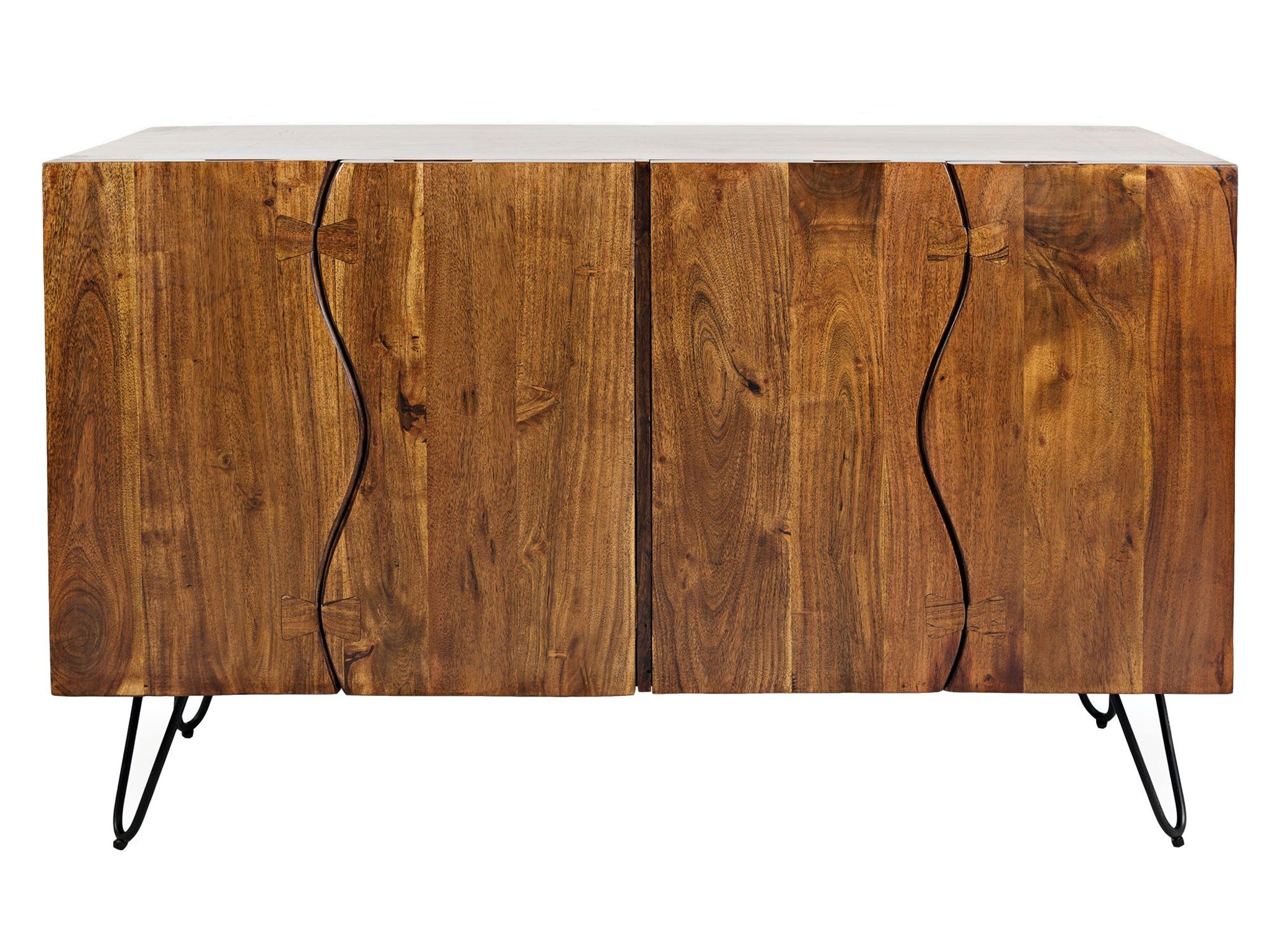 Komoda Avola to idealne połączenie elegancji i surowości. Wykonana z drewna akacjowego w ciepłym odcieniu orzecha włoskiego, jej wyjątkowy charakter wynika z nieregularnych kształtów drzwi, które nadają meblowi unikalny wygląd. Widoczna struktura drewna, która jest naturalną cechą materiału, sprawia, że każda komoda jest niepowtarzalna. Czarne metalowe nogi typu hairpin stanowią eleganckie, ale jednocześnie nowoczesne wykończenie, które podkreśla surowy industrialny styl. Dzięki tym wyjątkowym cechom, komoda Avola idealnie pasuje do wnętrz w stylu loftowym oraz industrialnym, dodając im wyjątkowego charakteru.